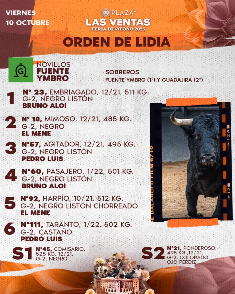 Seis novillos de Fuente Ymbro ya han sido sorteados y enchiquerados para el sexto festejo de la Feria de Otoño. Esta tarde, a las 18h., en la Plaza de Toros de Las Ventas serán lidiados por Bruno Aloi, El Mene y Pedro Luis.