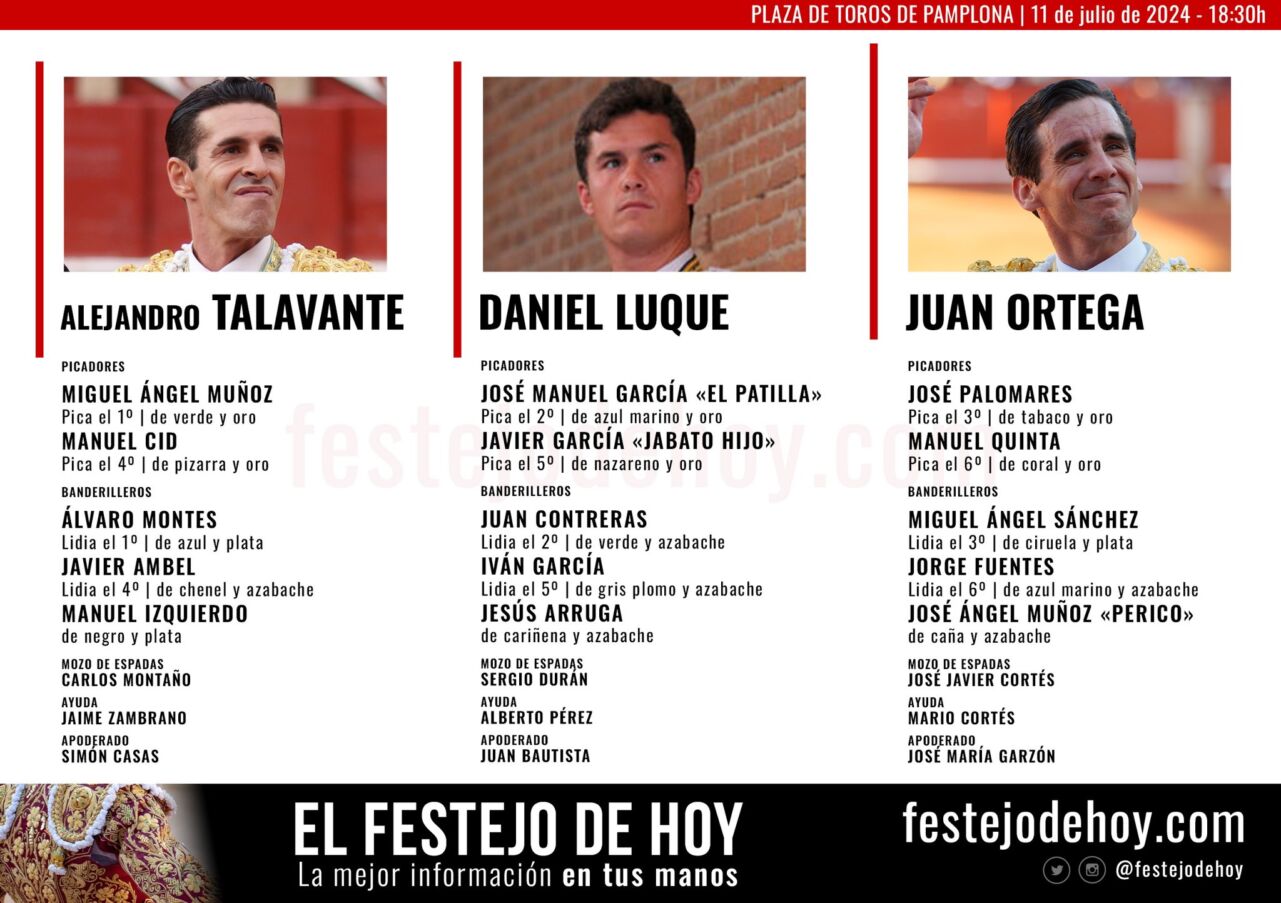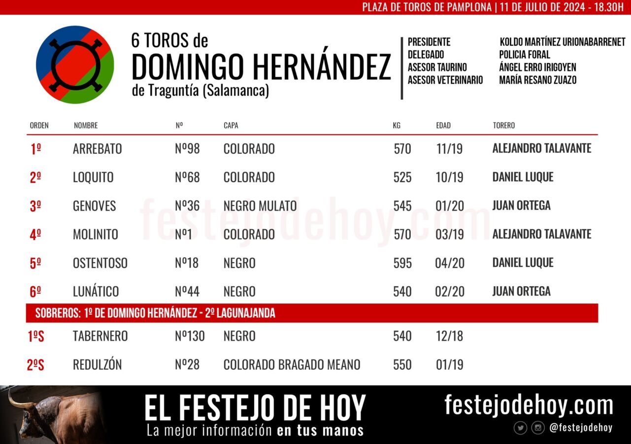 Sorteados y enchiquerados los toros de la ganadería de Domingo Hernández, que debutan en San Fermín, serán lidiados esta tarde a las 18.30 horas en Pamplona por los diestros Alejandro Talavante, Daniel Luque y Juan Ortega.