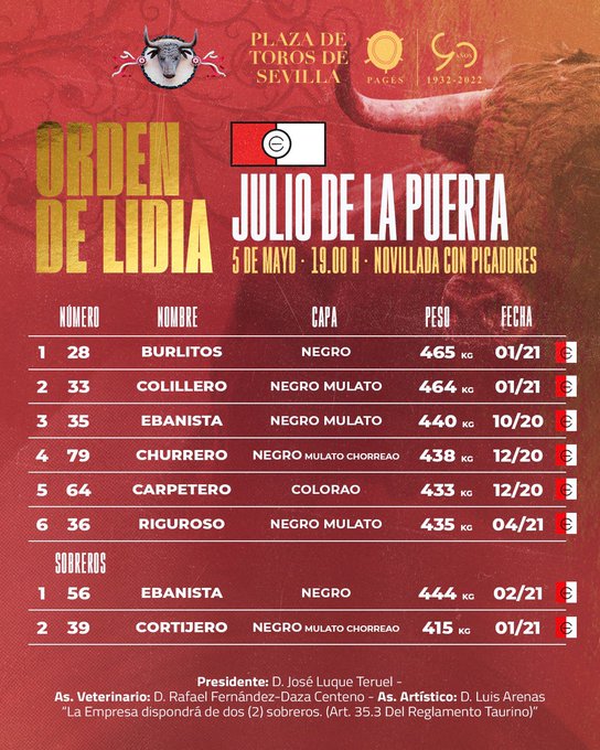 Ya se ha realizado el sorteo de los novillos de Julio de la Puerta que esta tarde se lidiarán en el decimosexto festejo de abono en Sevilla. El cartel lo componen Tristán Barroso, Samuel Navalón y Mariscal Ruiz. La novillada con picadores comienza a las 19.00 horas.