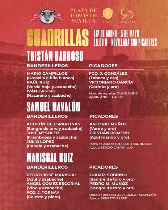 El orden de lidia y las cuadrillas son las siguientes: