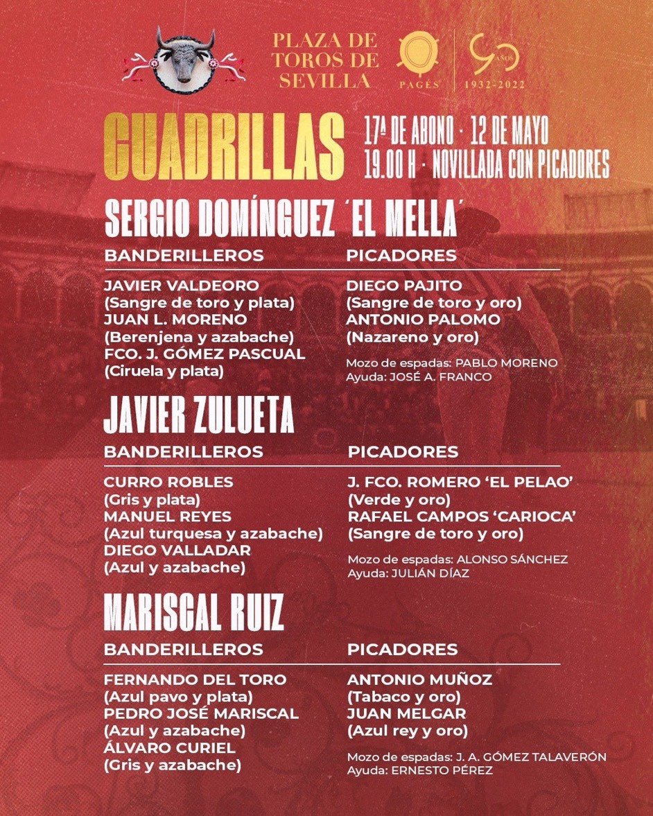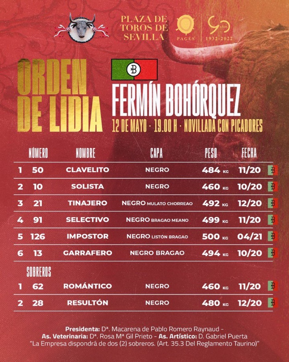 Ya se ha realizado el sorteo de los novillos de Fermín Bohórquez que esta tarde se lidiarán en la GRAN FINAL DEL CIRCUITO DE NOVILLADAS DE ANDALUCÍA, decimoséptimo festejo de abono en Sevilla. El cartel lo componen Sergio Domínguez ‘El Mella’, Javier Zulueta y Mariscal Ruiz. La novillada con picadores comienza a las 19.00 horas.