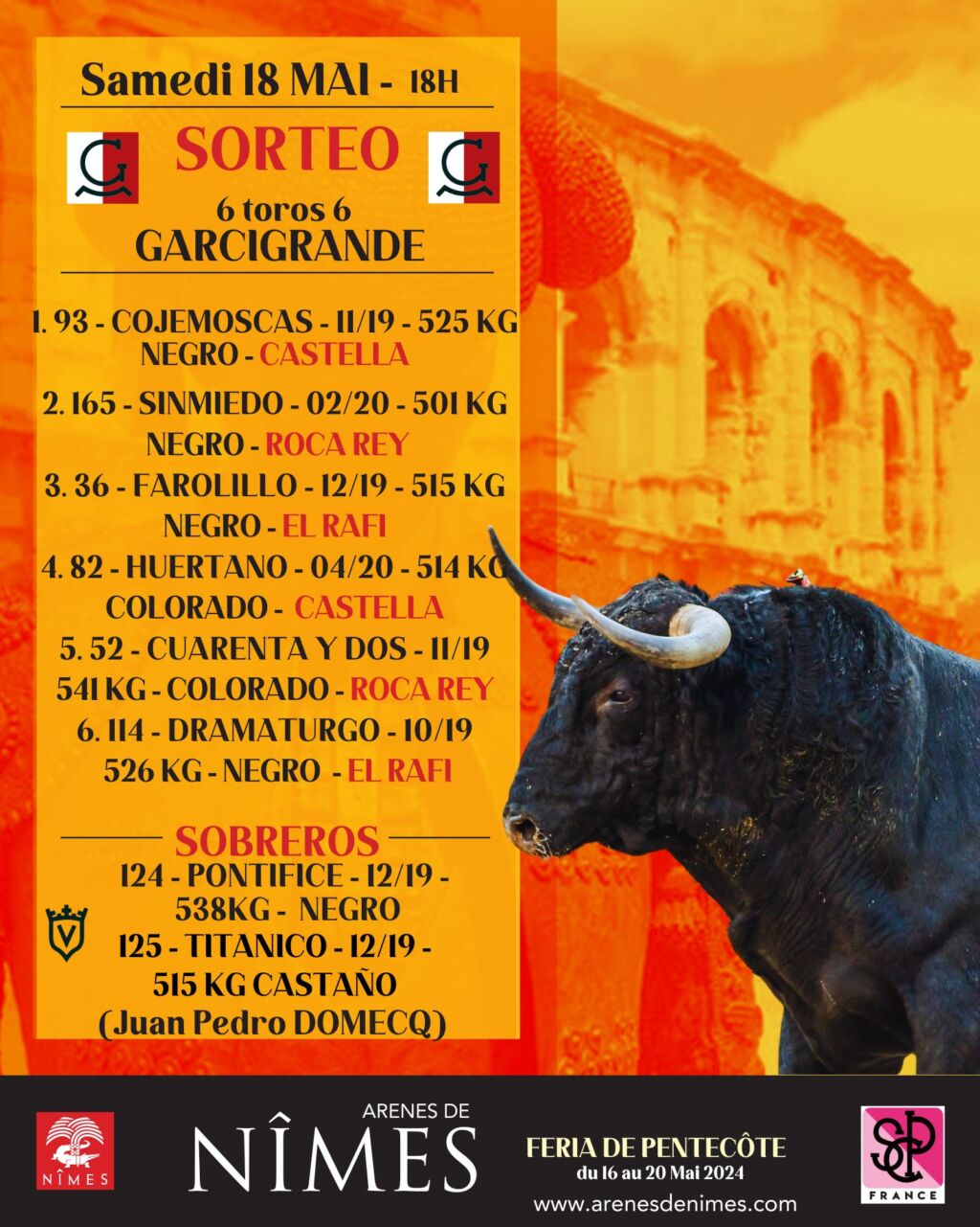 Sorteados y enchiquerados los toros de Garcigrande que será lidiados por Sebastián Castella, Andrés Roca Rey y El Rafi en la segunda de la Feria de Pentecostes en Nimes.
