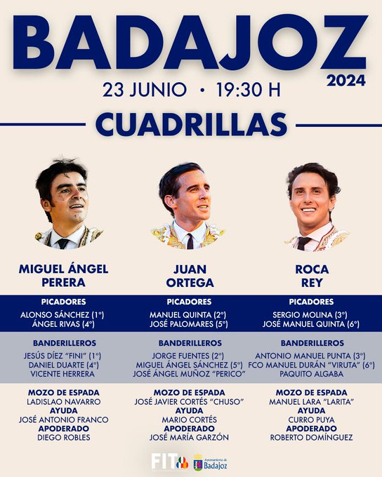 Sorteados y enchiquerados los toros de Núñez del Cuvillo que será lidiados en la Plaza de Toros de Badajoz, segunda de Feria, por los diestros Miguel Ángel Perera, Juan Ortega y Andrés Roca Rey.