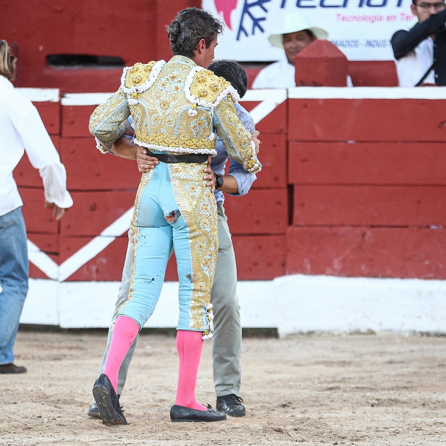 El parte médico indica la presencia de dos heridas por asta de toro: una en la cara interna del glúteo derecho, con un trayecto aproximado de 15 centímetros, y otra en la cara interna del tercio inferior del muslo izquierdo, con un trayecto de 8 centímetros, ambas con laceración del tejido celular subcutáneo y sin compromiso muscular. Se realizó exploración, lavado quirúrgico exhaustivo, debridación, hemostasia y cierre por planos, sin complicaciones.