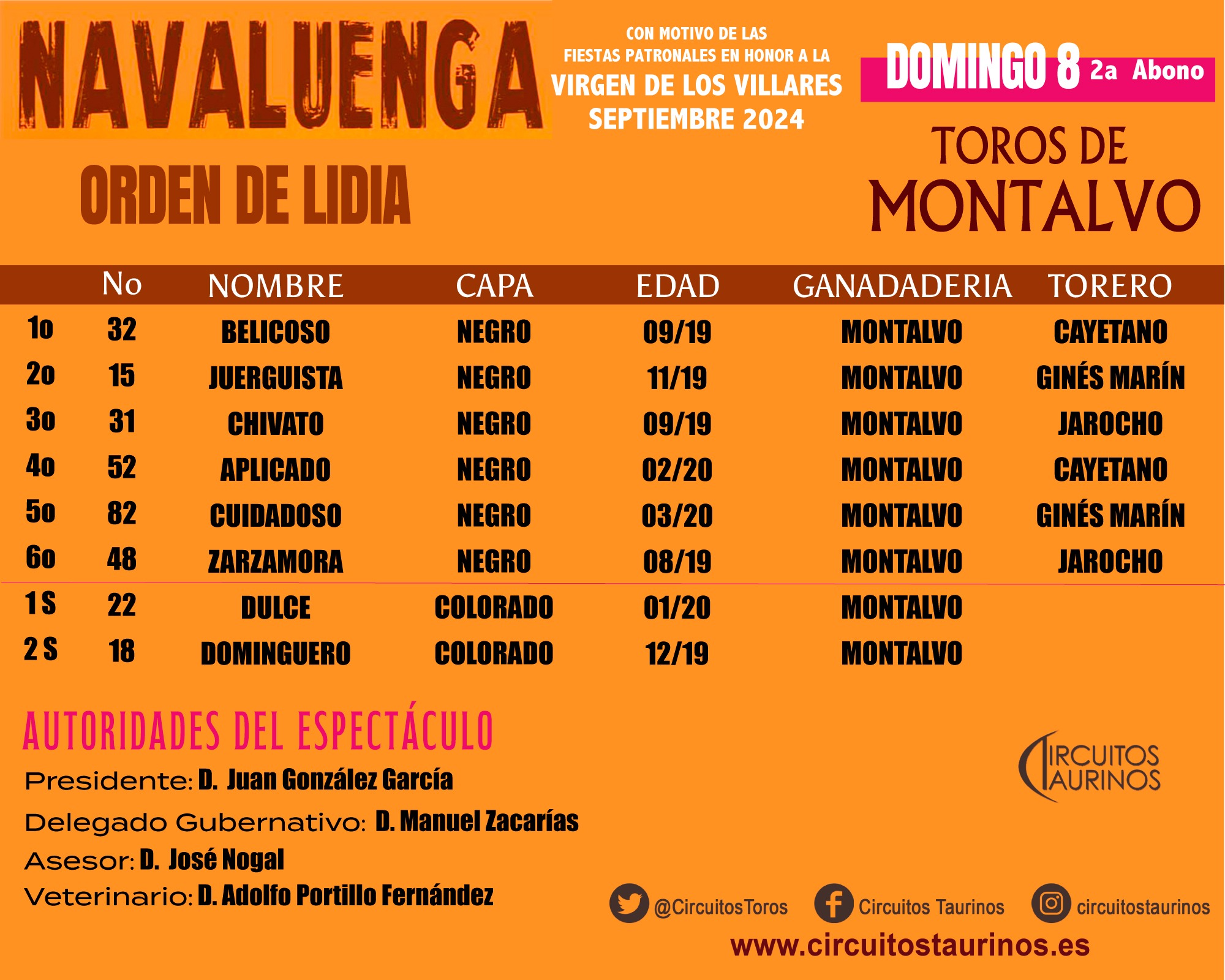 Estos son los datos de los astados y de las autoridades que rigen el espectáculo: