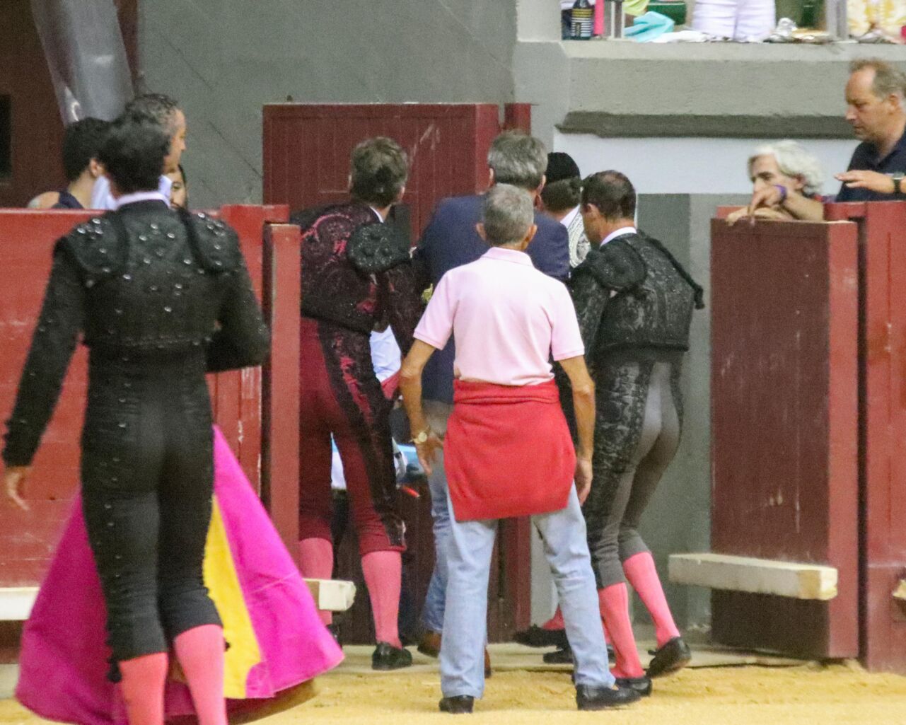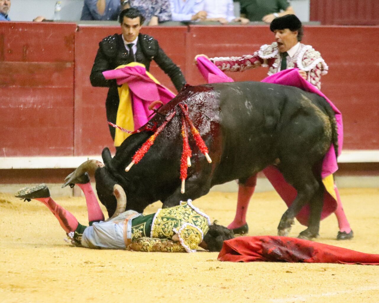 «herida por asta de toro en el muslo derecho, tercio medio cara anterior con una trayectoria ascendente superficial, que afecta fibras del músculo del cuádriceps, y otra trayectoria hacia dentro, bordeando al fémur. No existe sangrado copioso. Se procede a la intervención, haciendo limpieza y drenaje de los trayectos del pitón. Así mismo, presenta una luxación del codo izquierdo, procediéndose a la reducción de la misma y la inmovilización. Pronóstico: grave. Se traslada a un centro hospitalario«