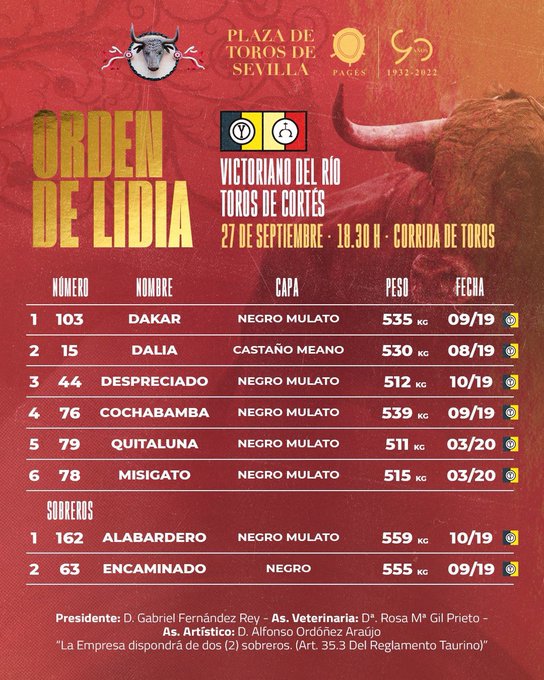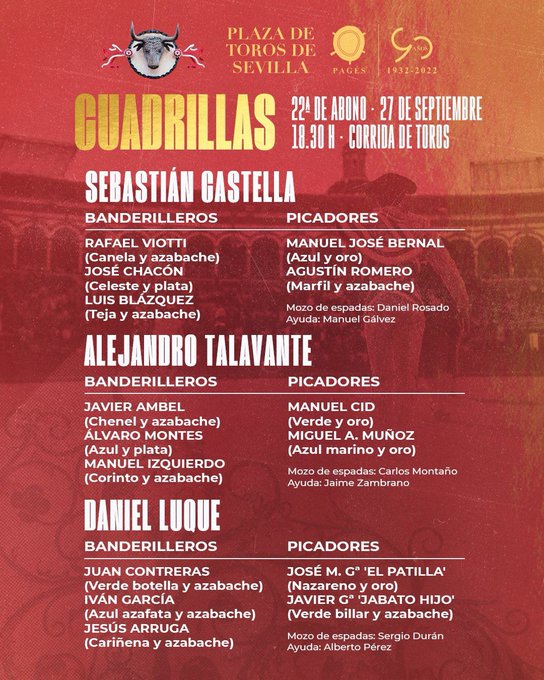 Las cuadrillas y el orden de lidia es el siguiente: