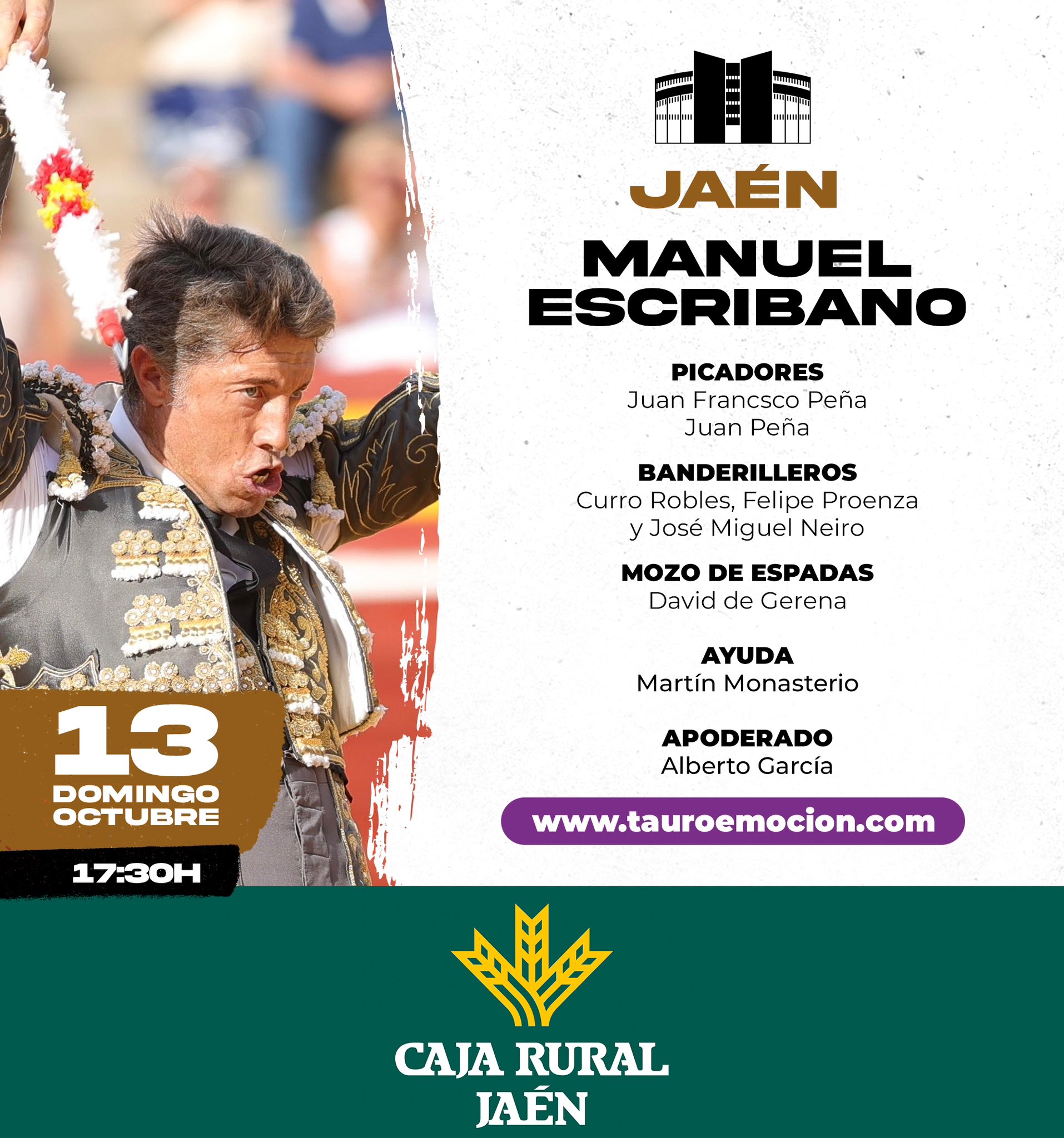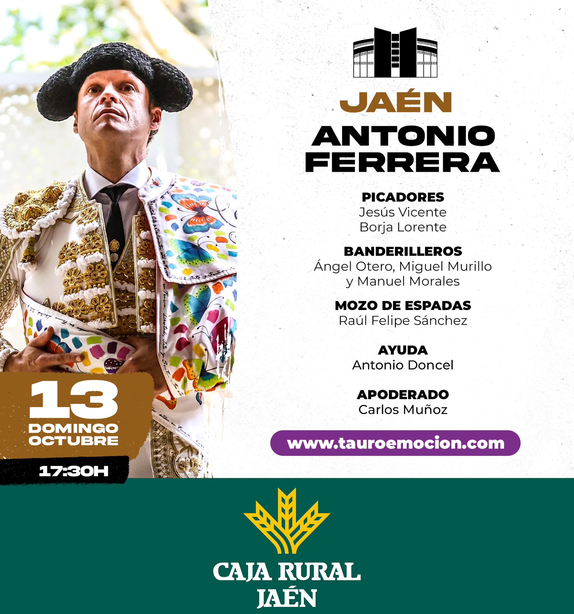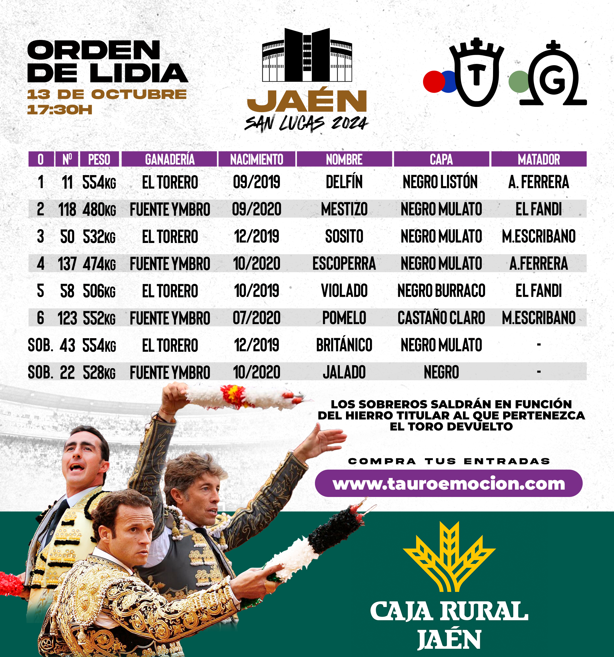 Sorteados y enchiquerados los toros de El Torero y Fuente Ymbro que se lidiarán esta tarde en el Coso de la Alameda de Jaén por los diestros Antonio Ferrera, El Fandi y Manuel Escribano. Las cuadrillas y el orden de lidia es el siguiente: Navegación de entradas «Pueblerino», de Antonio Pallas, abre la Final del Circuito de Castilla y León”Saca Cuartos”, de Zalduendo, abre la benéfica de Torrejón
