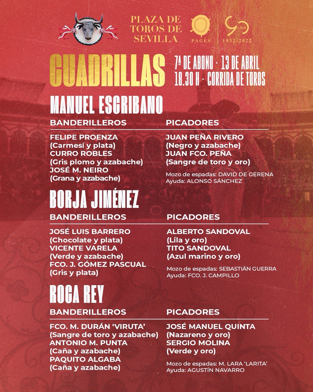 El orden de lidia y las cuadrillas son las siguientes: