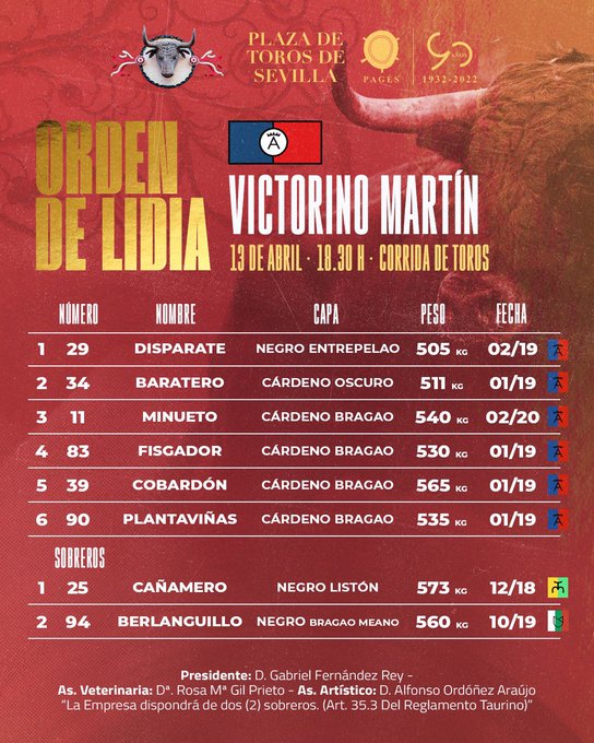 Ya se ha realizado el sorteo de los toros de Victorino Martín que esta tarde se lidiarán en el séptimo festejo de abono en Sevilla. El cartel lo componen Manuel Escribano, Borja Jiménez y Roca Rey. La corrida de toros comienza a las 18.30 horas.