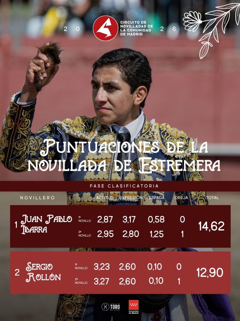 En la mañana del domingo se celebró la novillada de Estremera. Sergio Rollón y Juan Pablo Ibarra mataron los novillos de Ginés Bartolomé y Antonio Ordóñez. Ambos cortaron una oreja en su segundo novillo. Tras la deliberación del jurado, es Juan Pablo Ibarra el triunfador matemático del festejo, habiendo obtenido 14,62 puntos. Sergio Rollón, que obtuvo 12,90 puntos, clasifica a semifinales como primer mejor segundo.