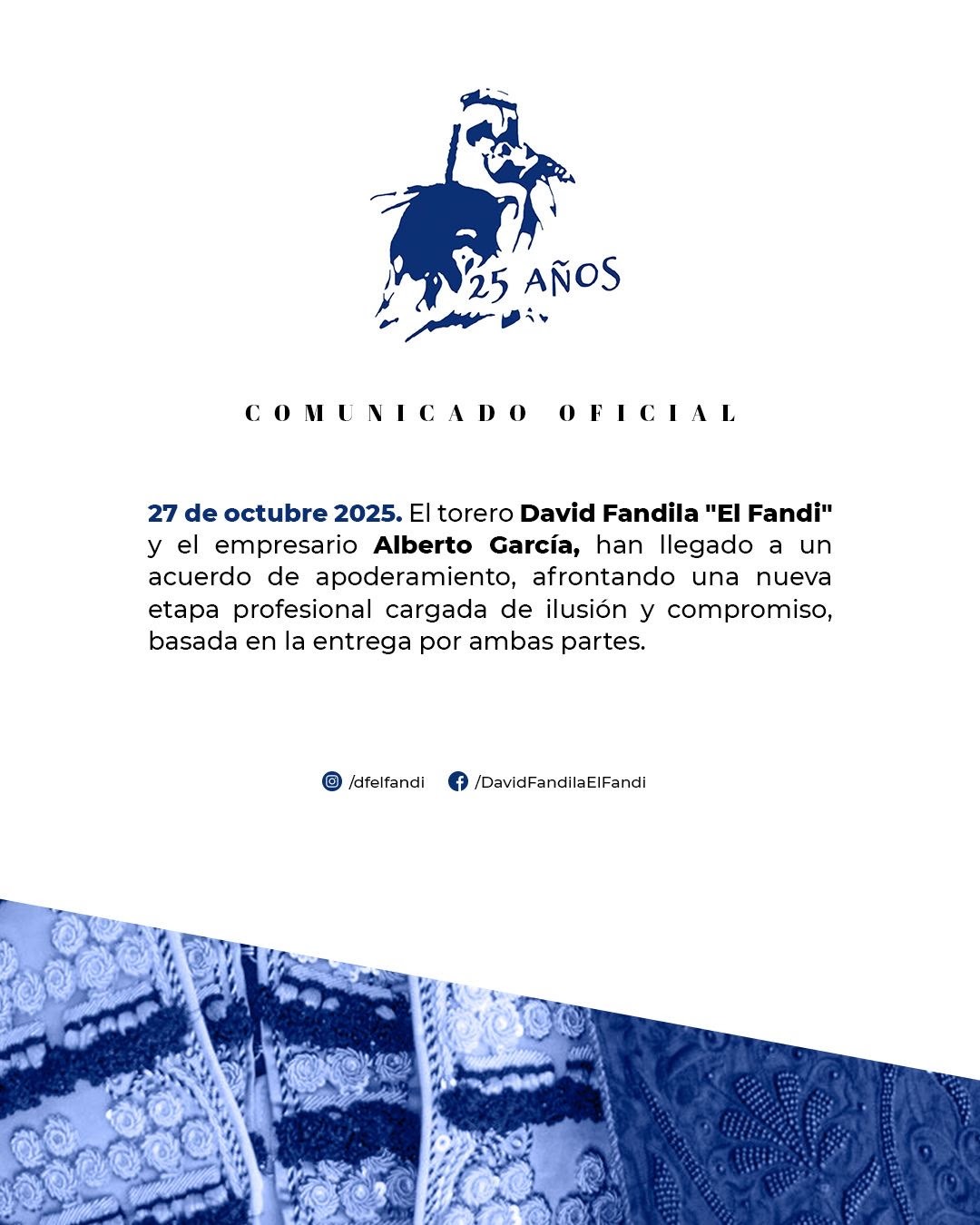 El torero, David Fandila “El Fandi”, y el empresario, Alberto García, han llegado a un acuerdo de apoderamiento, afrontando una nueva etapa profesional cargada de ilusión y compromiso, basada en la entrega por ambas partes.