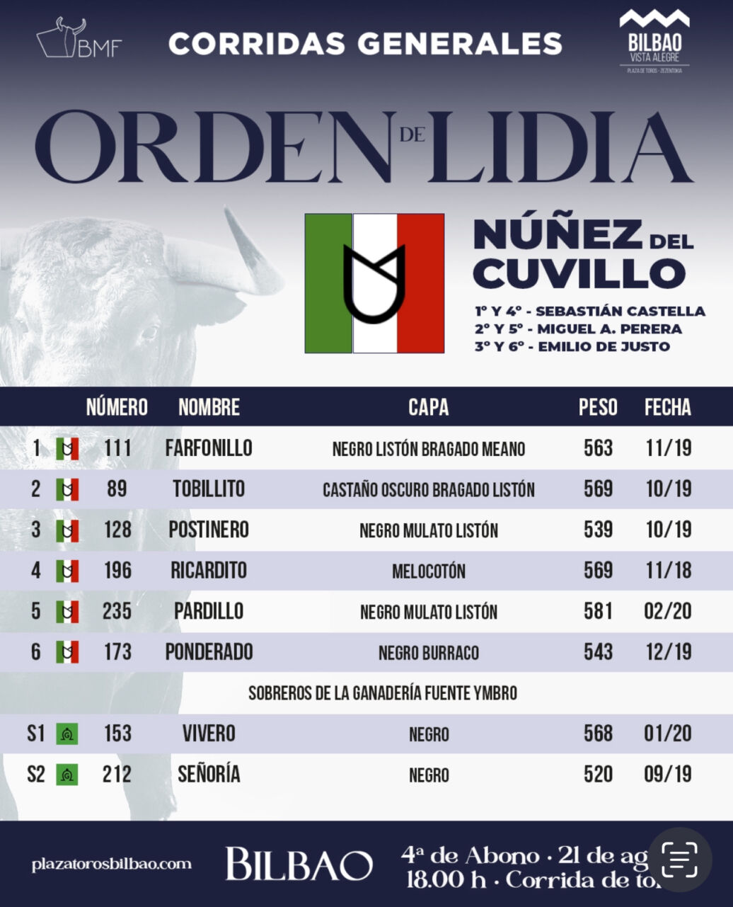 Sorteados y enchiquerados los toros de Núñez del Cuvillo para el tercer festejo de las Corridas Generales 2024 de Bilbao y que serán lidiados por los diestros Sebastián Castella, Miguel Ángel Perera y Emilio de Justo.