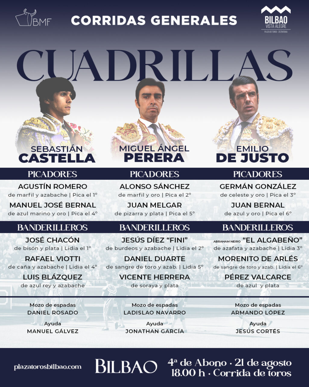 El orden de lidia y las cuadrillas son las siguientes: