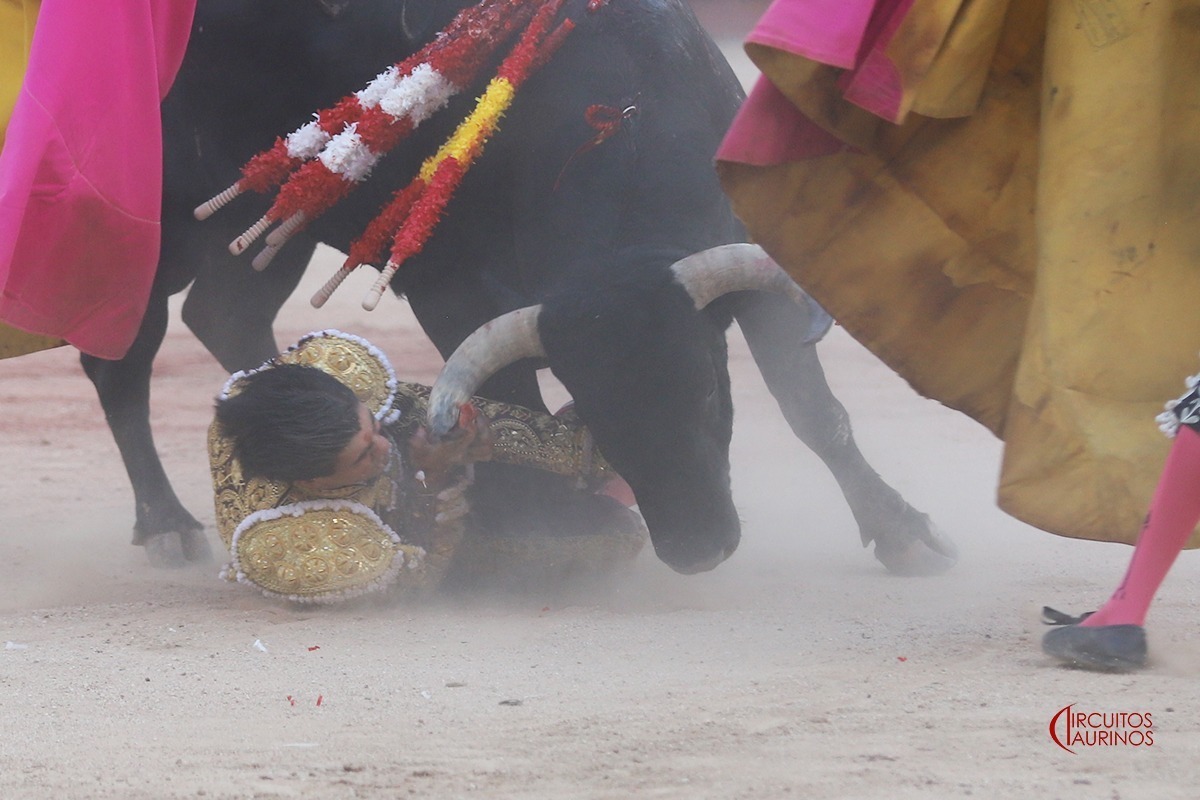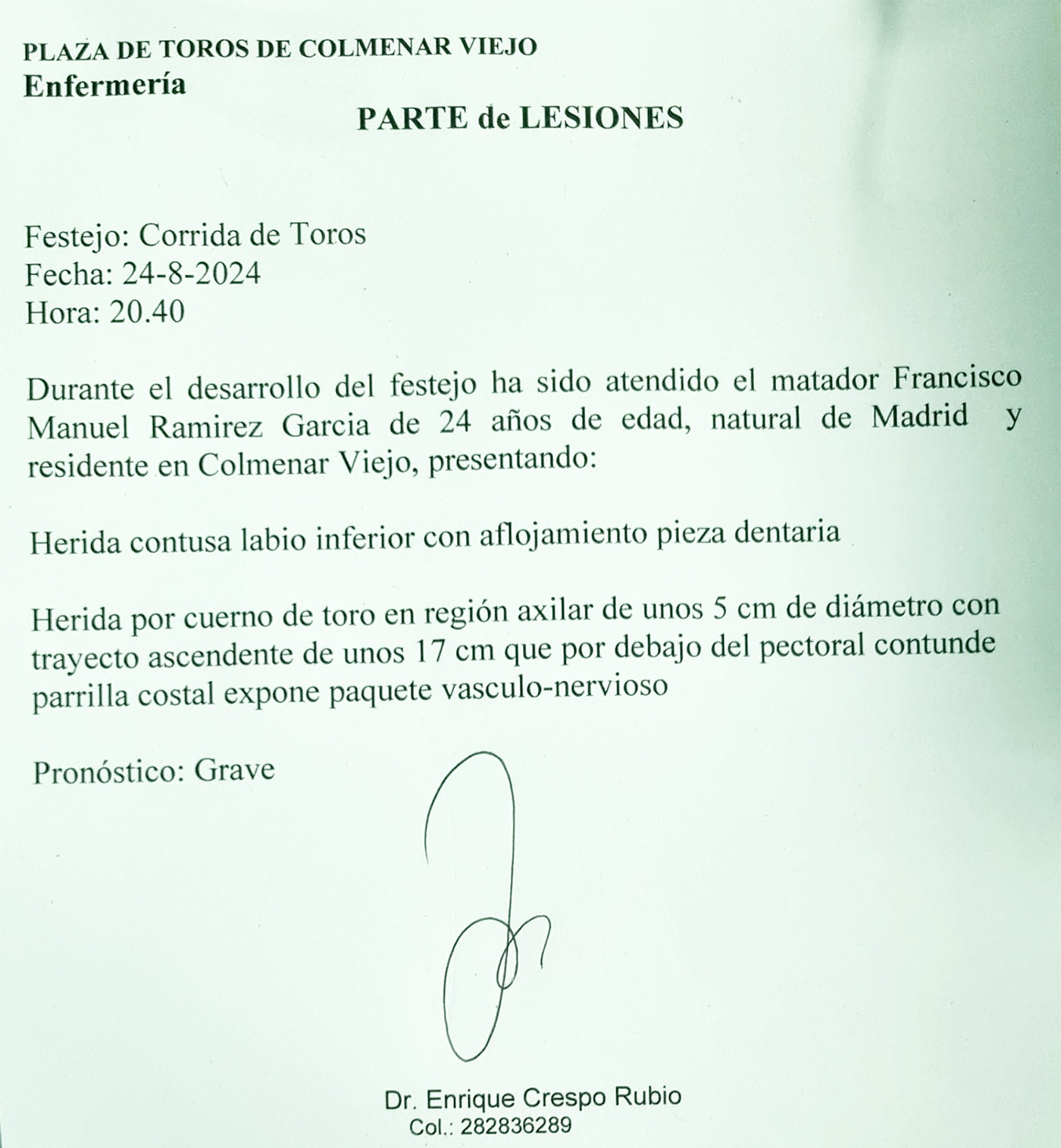 Durante el desarrollo del festejo ha sido atendido el matador Francisco Manuel Ramirez Garcia de 24 años de edad, natural de Madrid y residente en Colmenar Viejo, presentando: Herida contusa labio inferior con aflojamiento pieza dentaria.