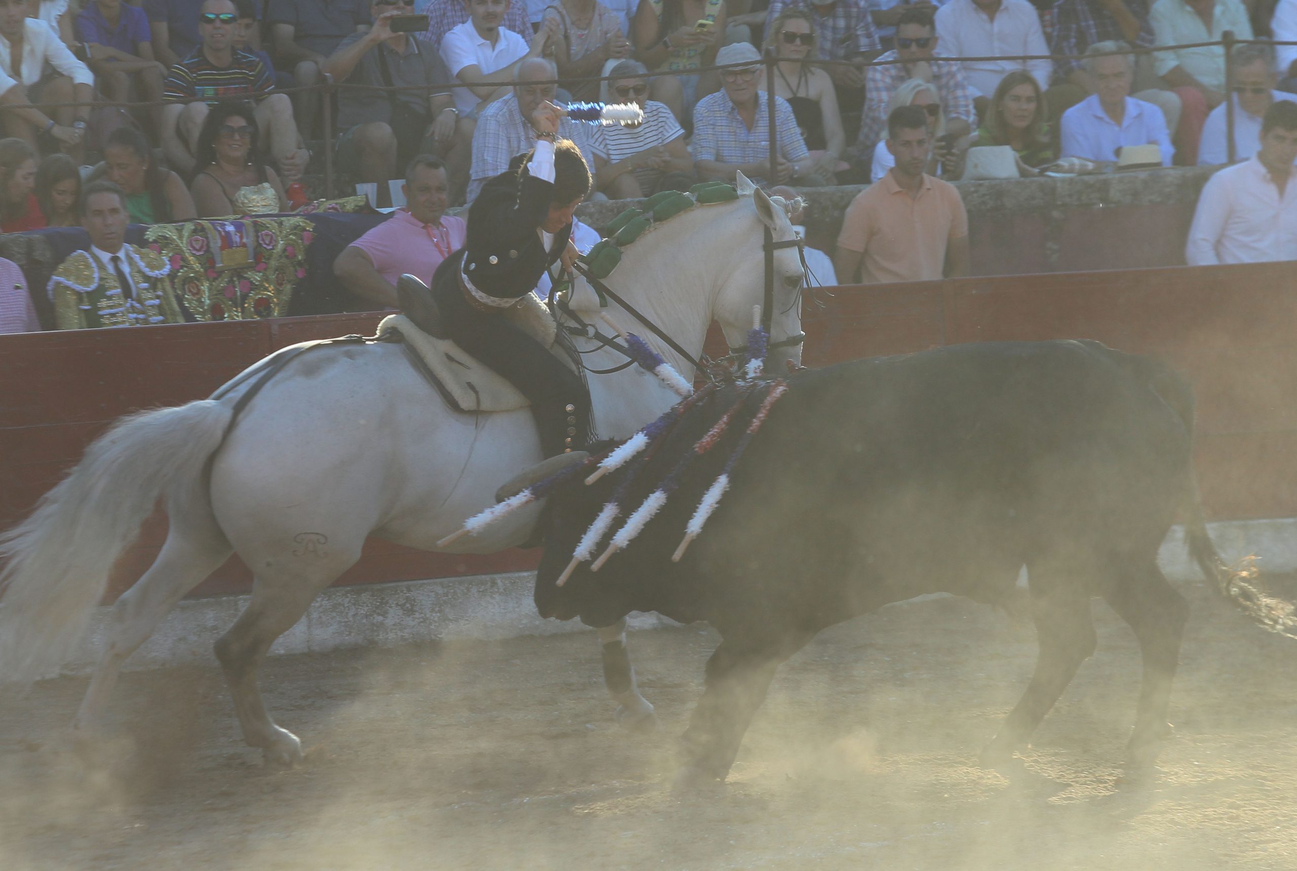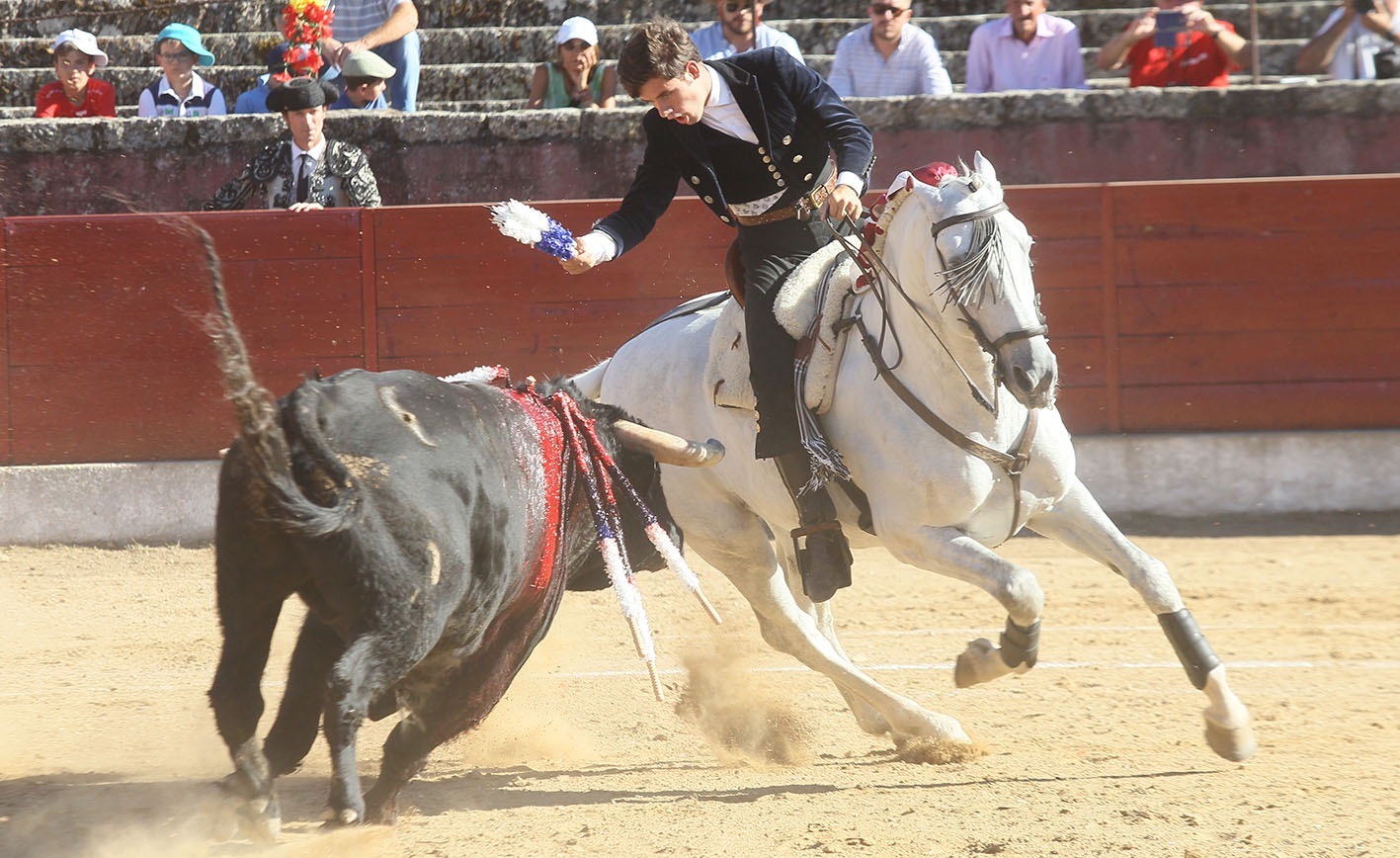 Continuó con esa majestuosidad del toreo de frente con tres banderillas a lomos de ECUADOR al estribo, incluso superando la poca colaboración del toro en alguna de ellas que hizo al caballo dudar, pero al que Guillermo le devolvió la moral. Con EXTRAÑO cambió a un registro de toreo de cercanía, más frontal y aguantando más en la cara del toro. Con JUSTICIERO las cortas y el par a dos manos fueron el prologo a medio rejón en buen sitio que hizo doblar. Se volvió a hacer el