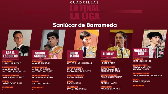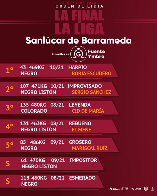 Sorteados y enchiquerados los novillos de Fuente Ymbro que serán lidiados en la Final de la Liga de Novilladas en la plaza de toros de Sanlúcar de Barrameda por los novilleros Borja Escudero, Sergio Sanchez, Cid de Maria, El Mene y Mariscal Ruiz.