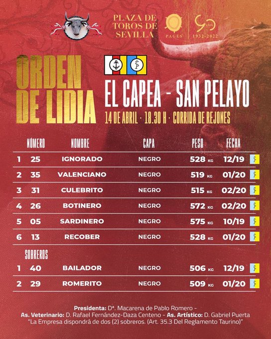Ya se ha realizado el sorteo de los toros de El Capea – San Pelayo que esta tarde se lidiarán en el octavo festejo de abono en Sevilla. El cartel lo componen Sergio Galán, Diego Ventura y Guillermo Hermoso de Mendoza. La corrida de toros comienza a las 18.30 horas.