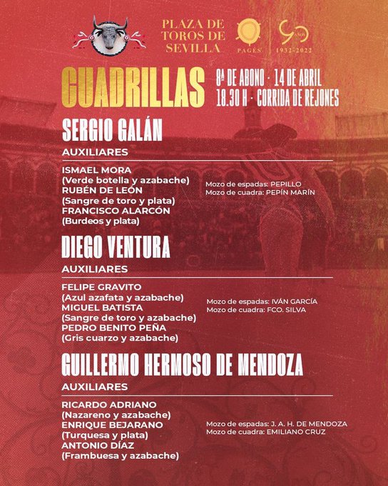 El orden de lidia y las cuadrillas son las siguientes: