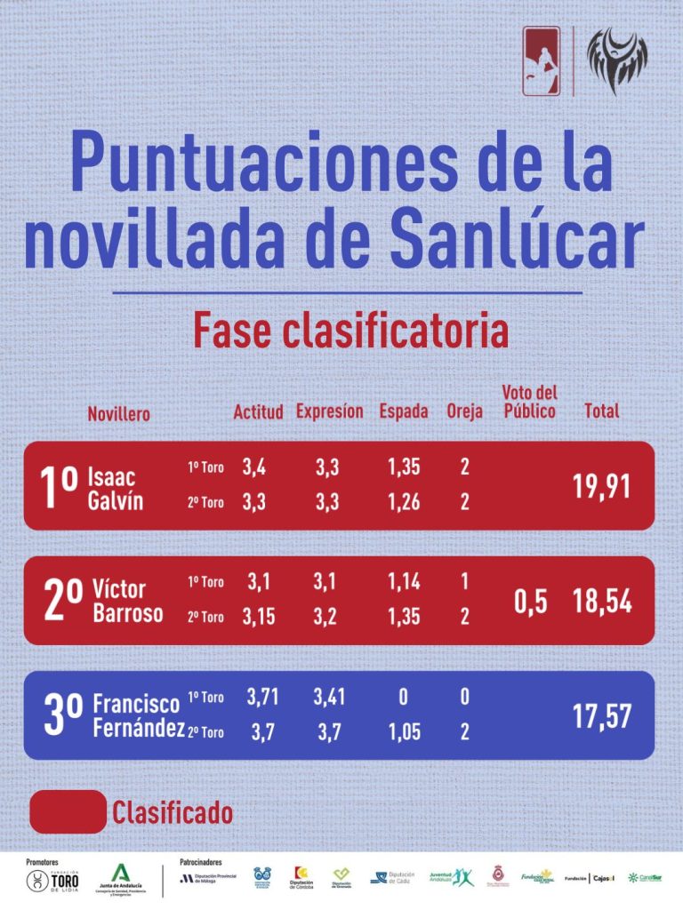Por su parte, Víctor Barroso, de El Puerto de Santa María, volvió a demostrar su regularidad y capacidad de conexión con los tendidos. El portuense sumó 18,04 puntos del jurado, a los que añadió los 0,5 puntos extra del voto del público, gracias al respaldo mayoritario de la afición, alcanzando así los 18,54 puntos que le aseguran la segunda plaza.