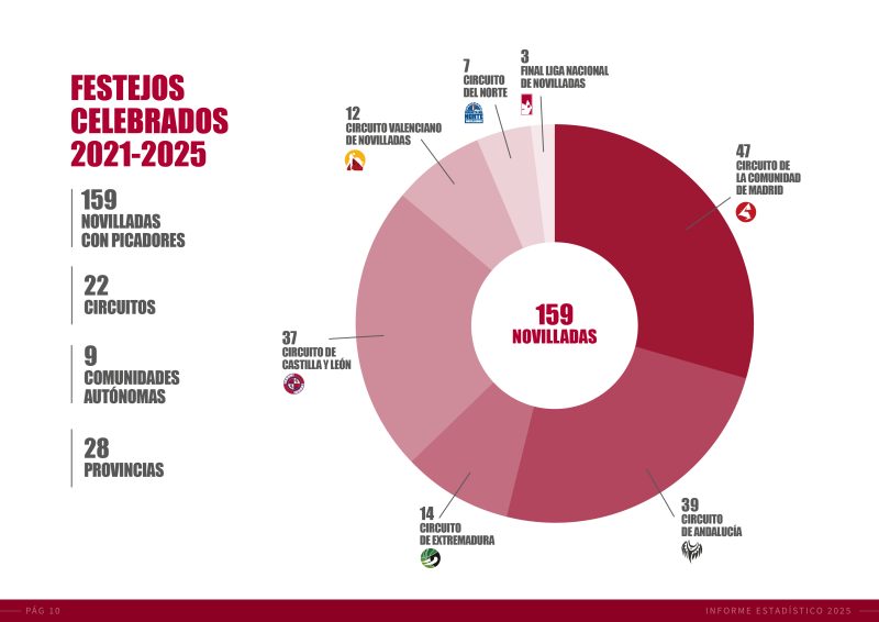 En este tiempo se han celebrado un total de 159 novilladas con caballos, repartidas en circuitos de 9 comunidades autónomas diferentes, pasando por 28 provincias y 108 localidades. Plazas en las que han lidiado 144 ganaderías, algunas de ellas erepitiendo en varias ocasiones.