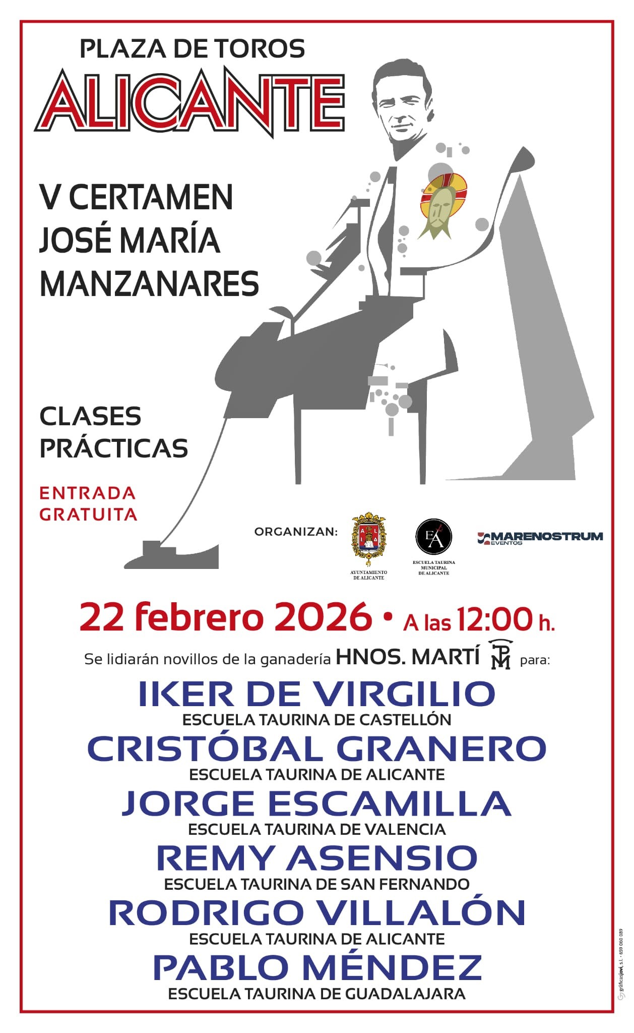 El certamen está organizado por el Ayuntamiento de Alicante, la Escuela Taurina Municipal de Alicante y la empresa Eventos Mare Nostrum. Durante la mañana, a partir de las 12:00 horas, se lidiarán novillos de la joven ganadería Hermanos Martí, de Bocairent (Valencia), debutantes en plaza de segunda categoría, que servirán de base para la actuación de los siguientes novilleros: Iker de Virgilio, de la Escuela Taurina de Castellón; Cristóbal Granero y Rodrigo Villalón, de la Escuela Taurina de Alicante; Jorge Escamilla, de la Escuela Taurina de Valencia; Remy Asensio, de la Escuela Taurina de San Fernando; y Pablo Méndez, de la Escuela Taurina de Guadalajara.