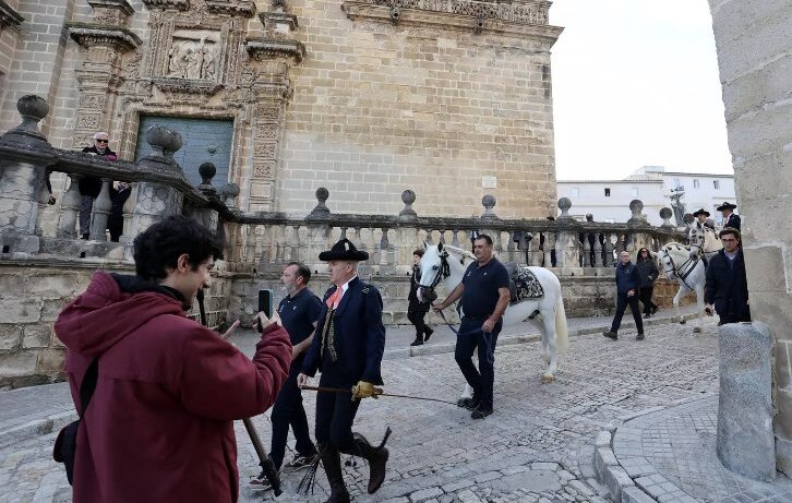 Doce caballos de la Real Escuela del Arte Ecuestre rindieron homenaje a Álvaro Domecq Romero, fundador de la institución, aguardando a las puertas de la catedral de Nuestro Señor San Salvador de Jerez de la Frontera, donde este miércoles se celebró el funeral en memoria del rejoneador y ganadero, fallecido el martes a los 85 años. La comitiva ecuestre, integrada por miembros de la escuela y encabezada por Rafael Olvera, partió desde la sede de la entidad hasta el templo jerezano.
