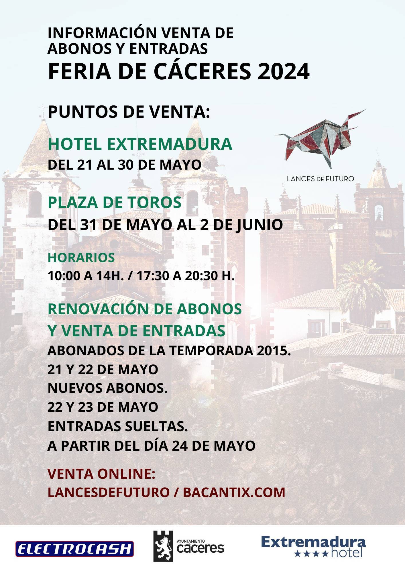 Para ello la empresa ha habilitado dos puntos de venta: uno en el Hotel Extremadura, del 21 al 30 de mayo; y la taquilla de la plaza de toros, que estará abierta del 31 de mayo al 2 de junio, días de los festejos.