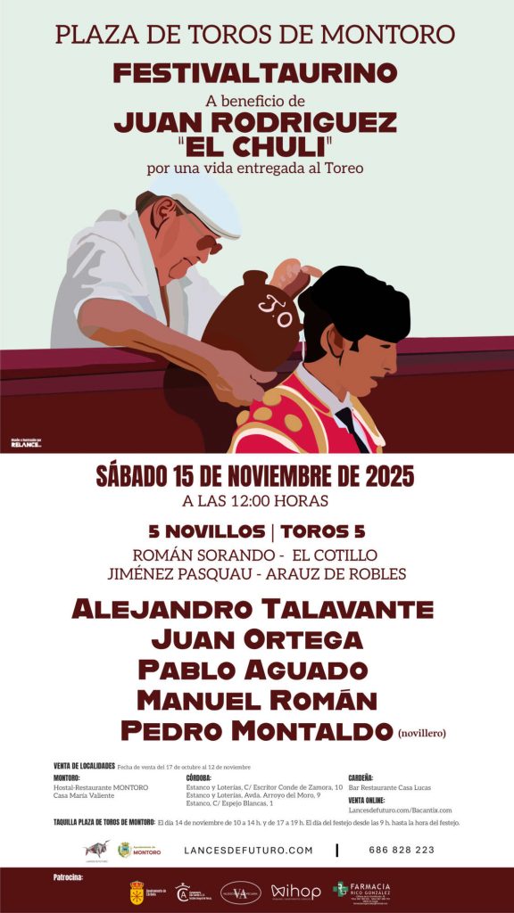 La empresa Lances de Futuro ha presentado oficialmente el cartel del festival taurino benéfico que se celebrará el próximo 15 de noviembre en la plaza de toros de Montoro, un emotivo festejo en homenaje al recordado Juan Rodríguez ‘El Chuli’.