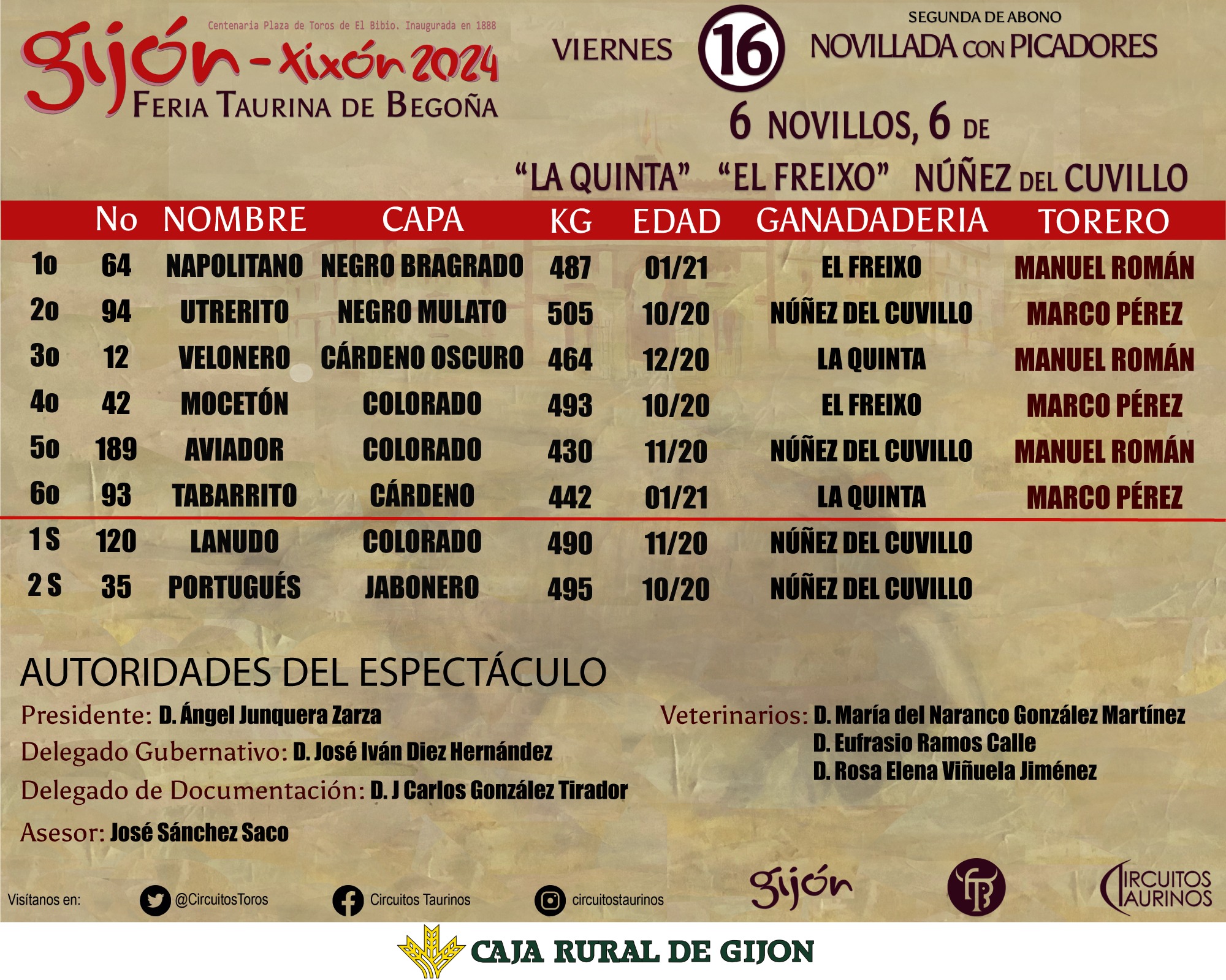 Este es el orden de lidia y la relación de cuadrillas y autoridades del espectáculo:
