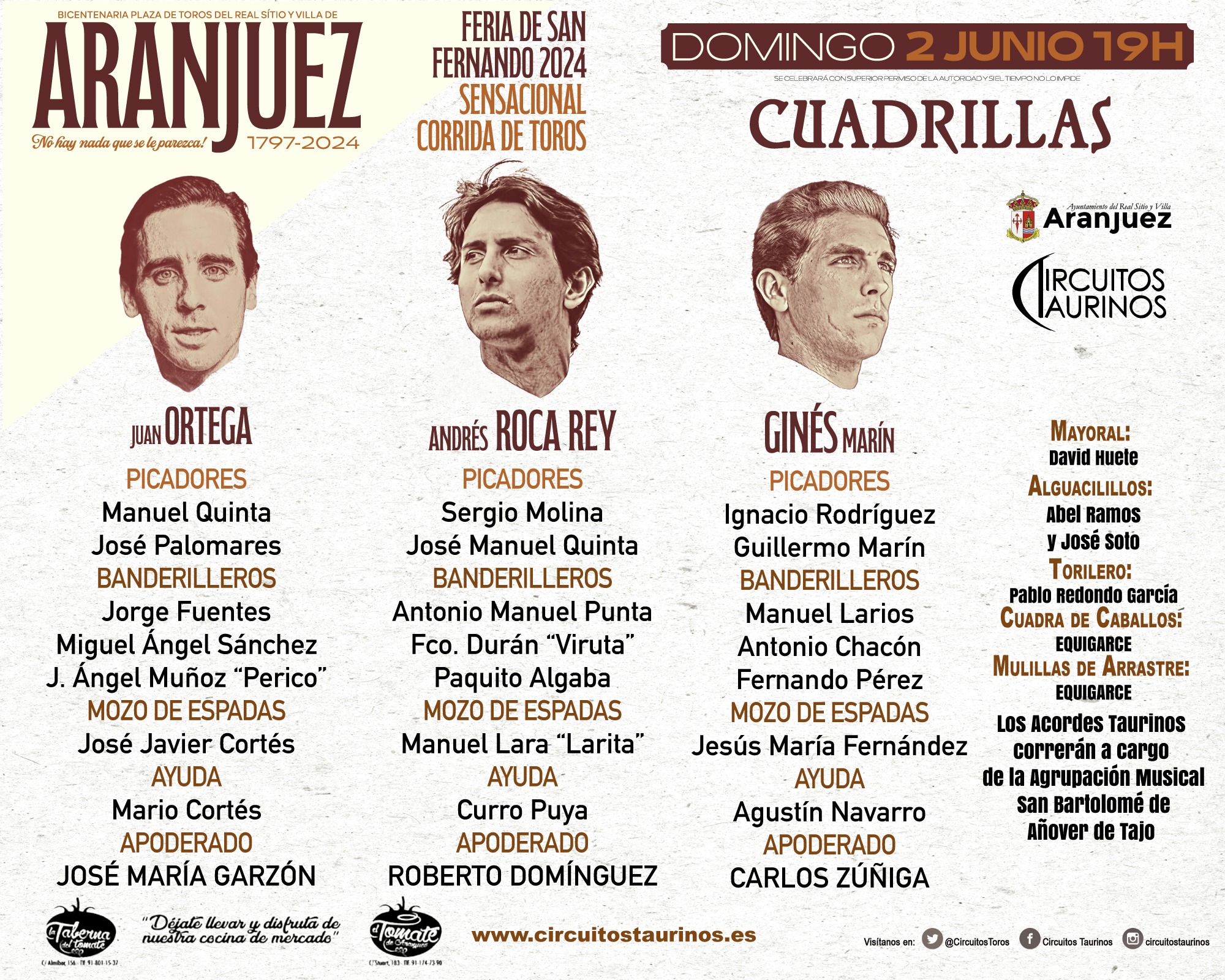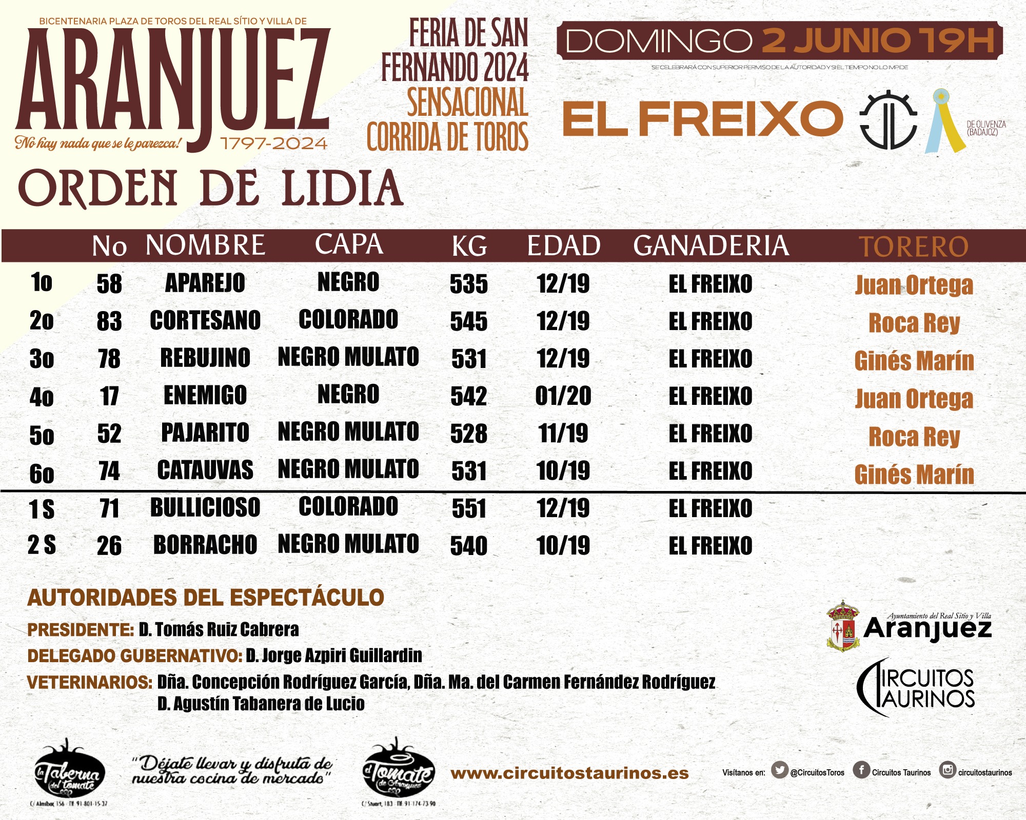Los matadores Juan Ortega, Andrés Roca Rey y Ginés Marín serán los encargados de su lidia. Los dos sobreros pertenecen igualmente a la divisa titular.