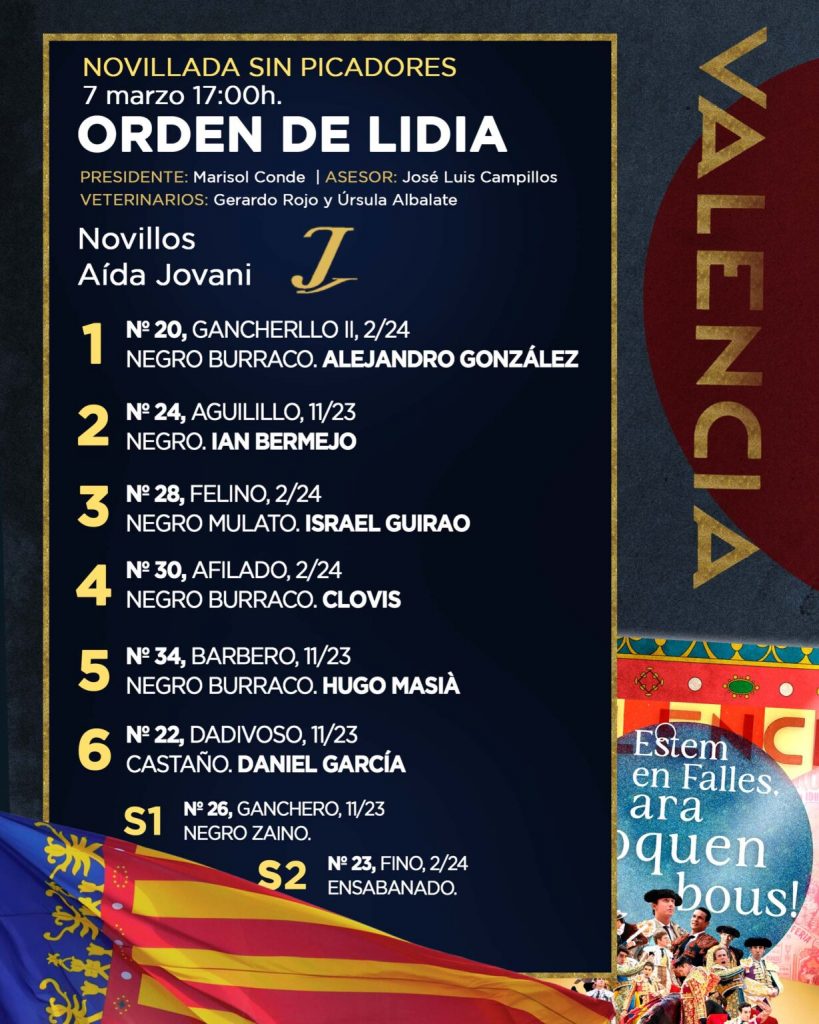 Seis reses de Aída Jovani han sido ya sorteadas y enchiqueradas en la Plaza de Toros de Valencia para la novillada sin picadores que hoy sábado abre la Feria de Fallas 2026. A las 17h. harán el paseíllo Alejandro González (Escuela Albacete), Ian Bermejo (Escuela Castellón), Israel Guirao, (Escuela Valencia), Clovis (Escuela Beziers), Hugo Masià (Escuela Valencia) y Daniel García (Escuela Yiyo de Madrid).