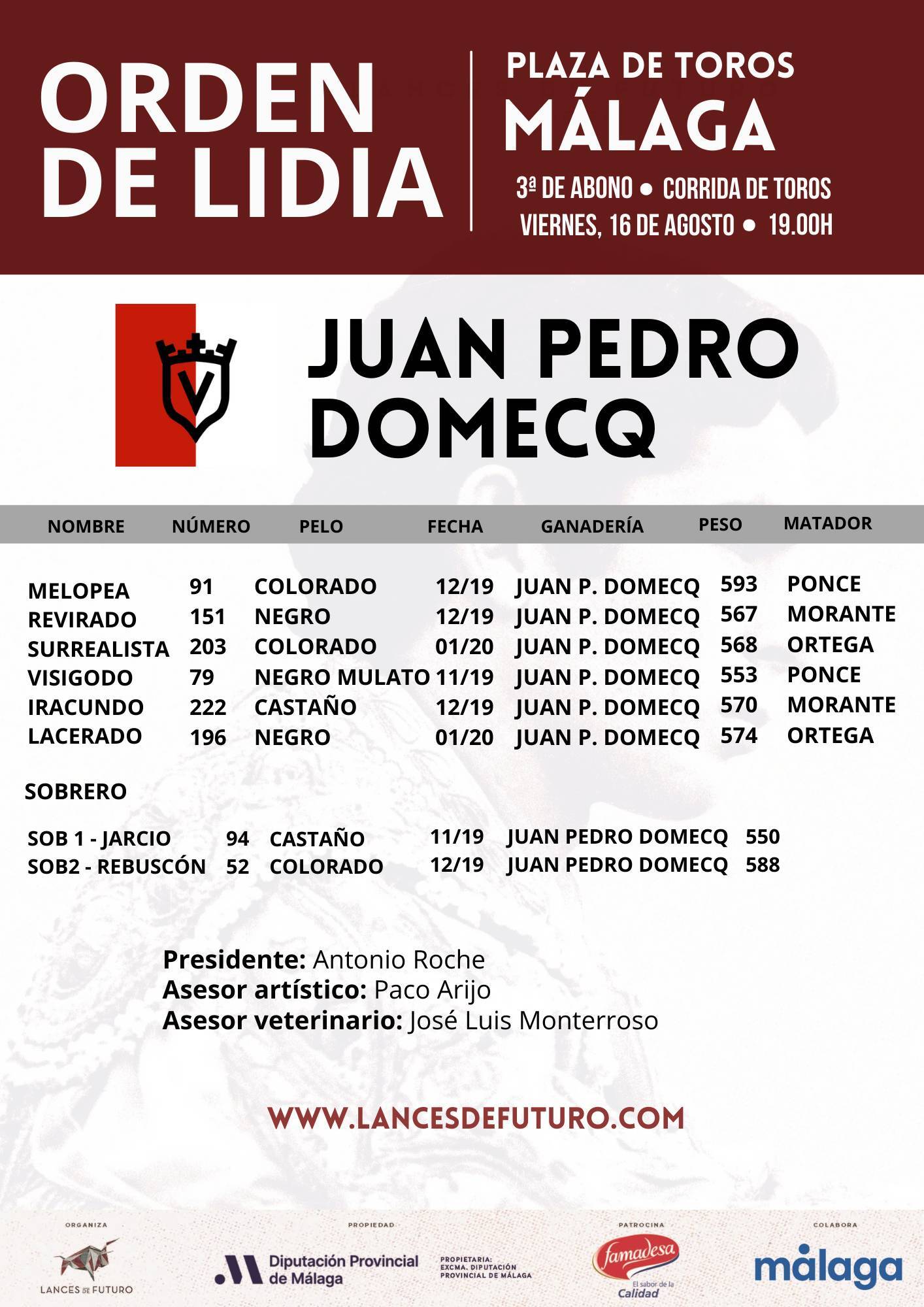 Sorteados y enchiquerados los toros de Juan Pedro Domecq que se lidiarán en la plaza de toros de Málaga por los diestros Enrique Ponce, Morante de la Puebla y Juan Ortega