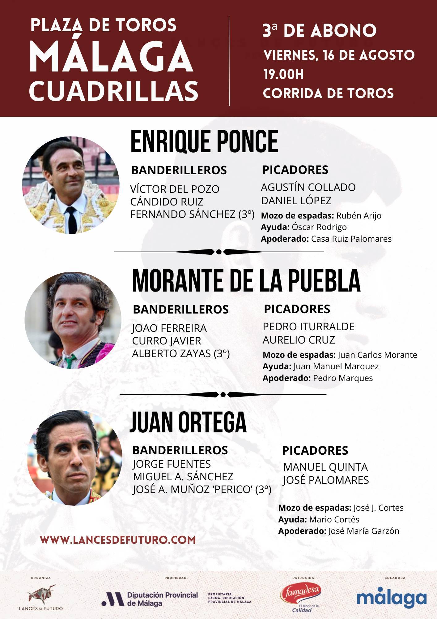 El orden de lidia y las cuadrillas son las siguientes: