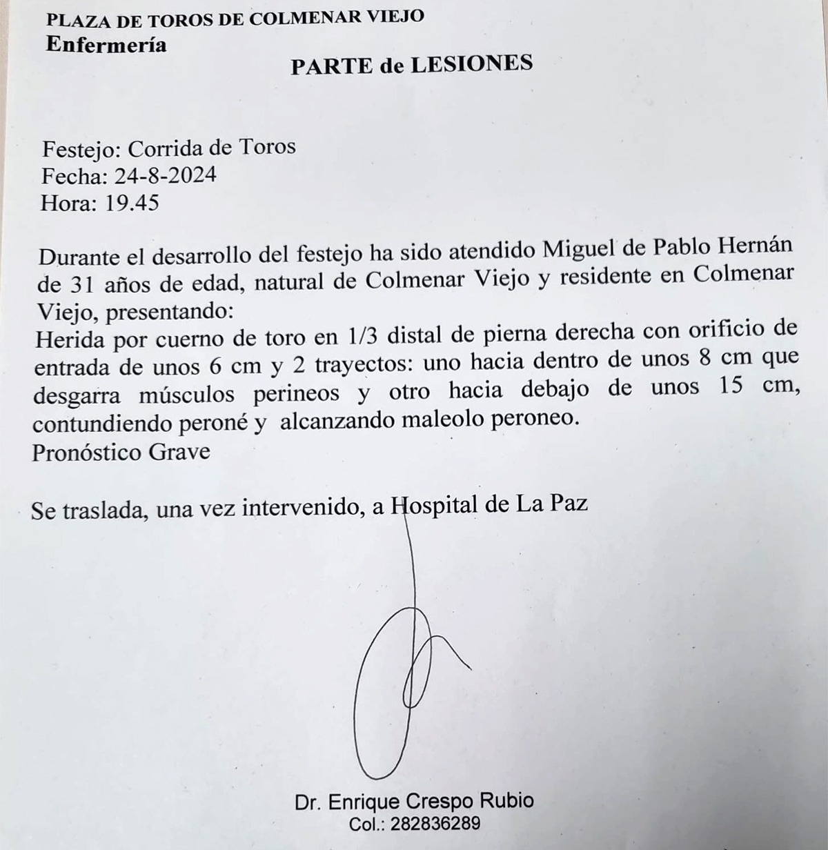 Miguel de Pablo herido en 1/3 distal de pierna derecha en Colmenar Viejo