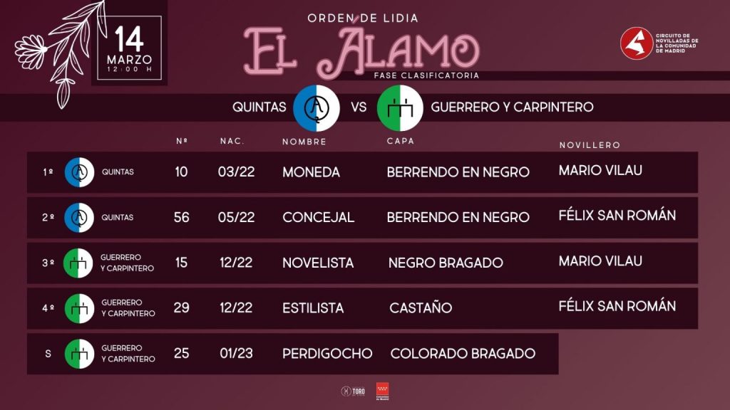 En la mañana de hoy se celebrará la primera clasificatoria del Circuito de Madrid 2026 en el El Álamo. Un cartel que componen Mario Vilau y Félix San Román, quienes lidiarán novillos de Guerrero y Carpintero y Quintas.