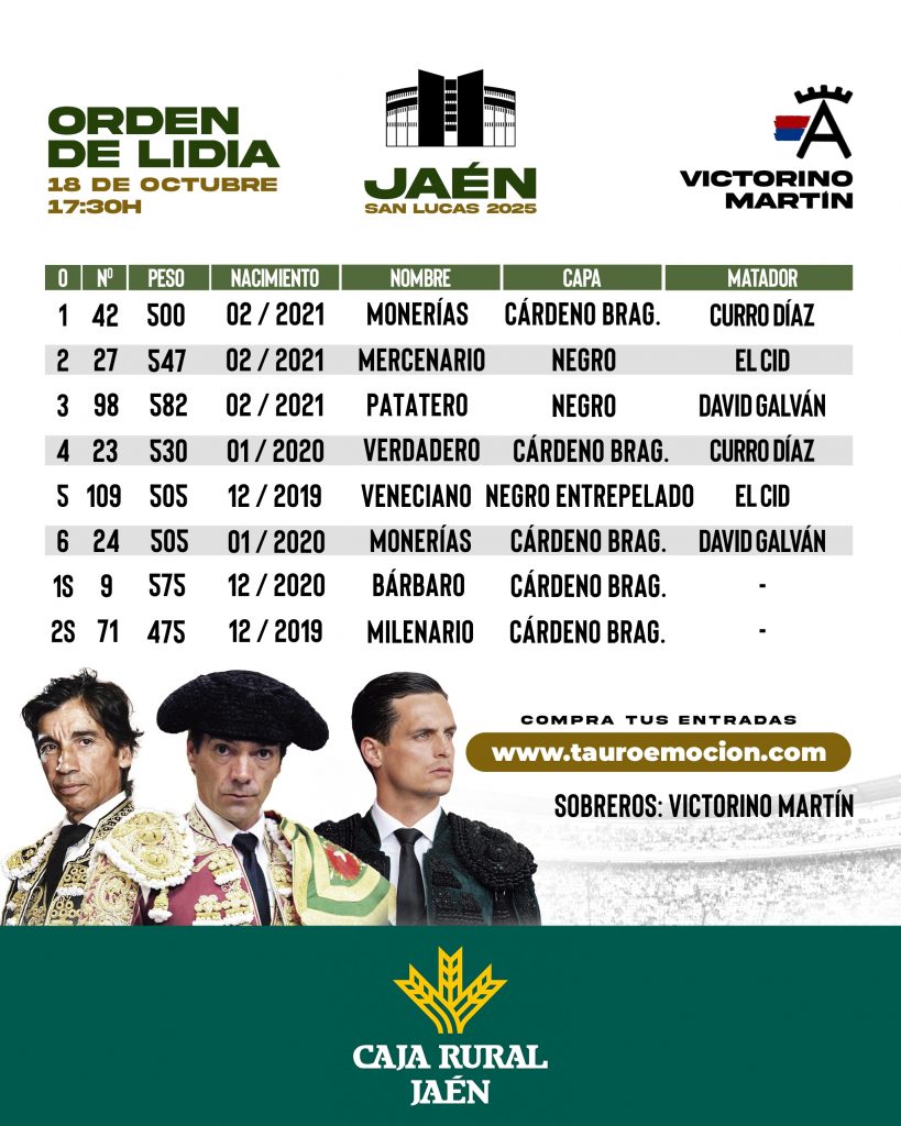 Sorteados y enchiquerados los toros de Victorino Martín para la segunda y última corrida de la Feria de San Lucas de Jaén y que serán lidiados por Curro Díaz, ‘El Cid’ y David Galván a partir de las 17.30 horas.