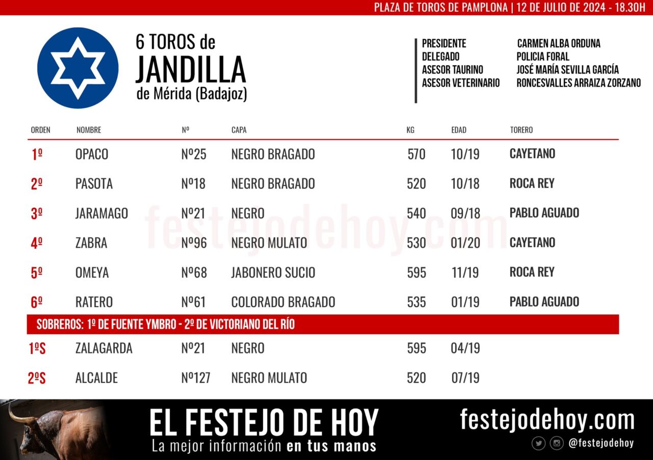 Sorteados y enchiquerados los toros de Jandilla que serán lidiados en la feria de San Fermín y que estoquerán los matadores de Cayetano, Roca Rey y Pablo Aguado.