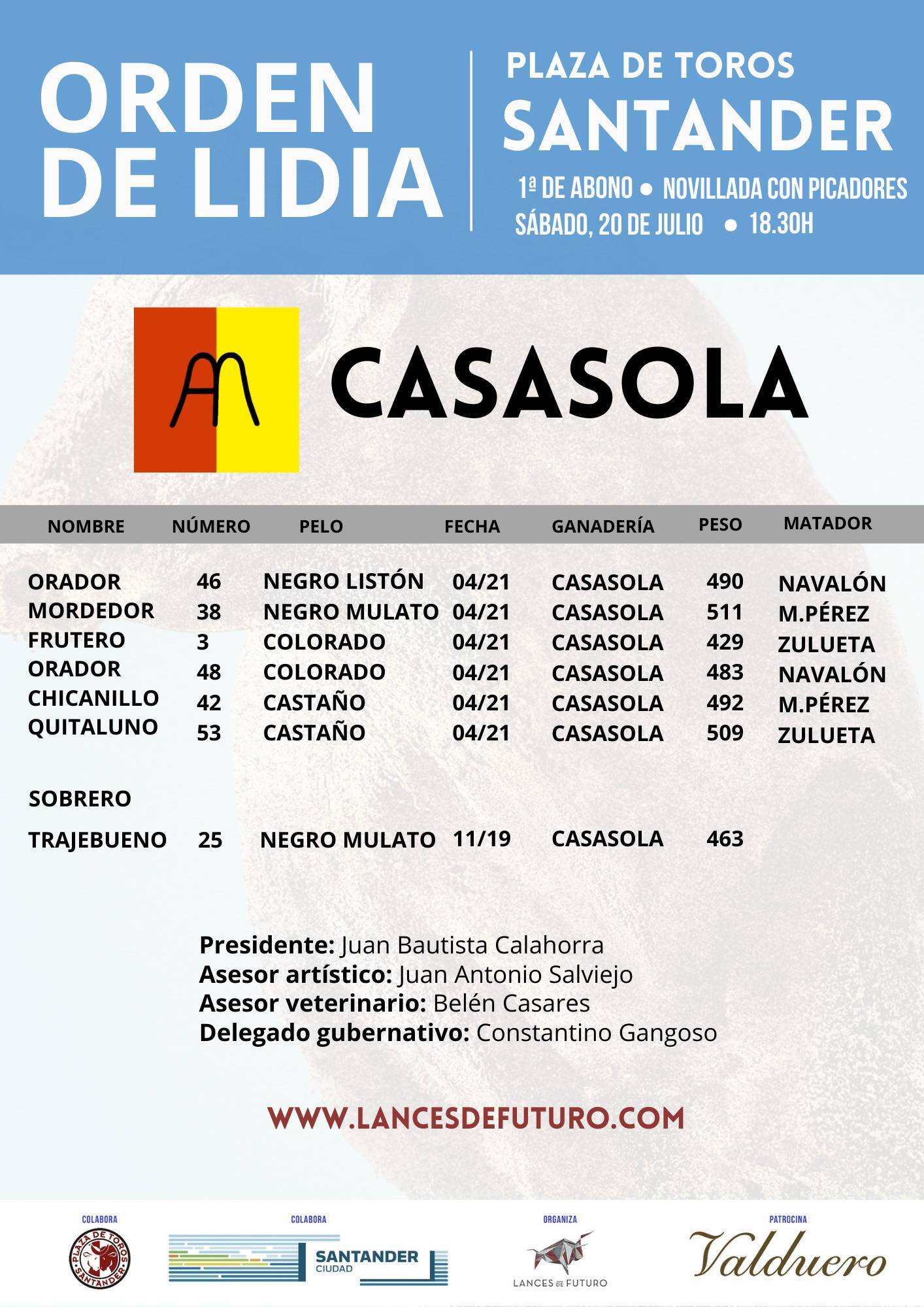 Sorteados y enchiquerados los novillos de Casasola, que serán lidiados en la plaza de toros de Santander, en el primer festejo de la Feria del Norte por los novilleros Samuel Navalón, Marco Pérez y Javier Zulueta. El festejo comienza a las 18:30 horas.