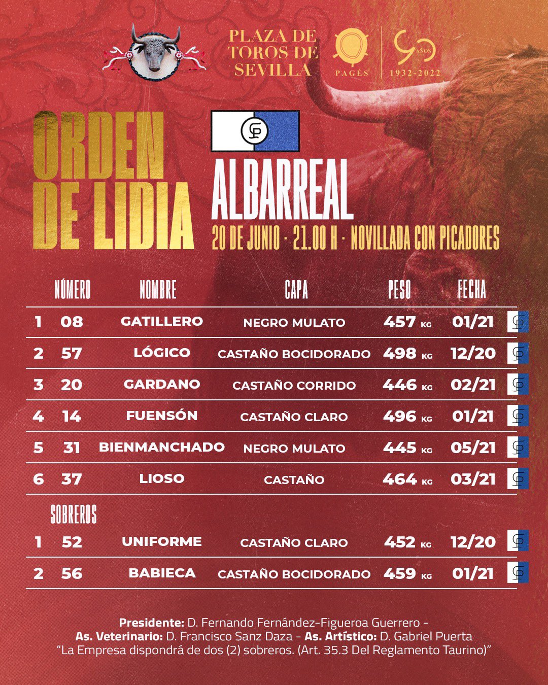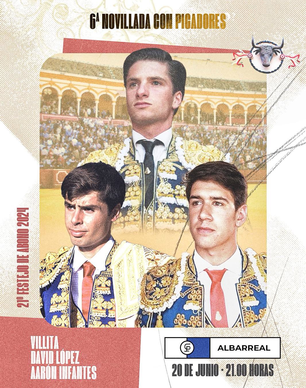 Ya se ha realizado el sorteo de los novillos de Albarreal que esta tarde se lidiarán en el vigésimo primer festejo de abono en Sevilla. El cartel lo componen Villita, David López y Aarón Infantes. La novillada con picadores comienza a las 21.00 horas.