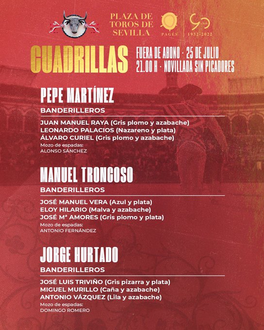 El orden de lidia y las cuadrillas son las siguientes: