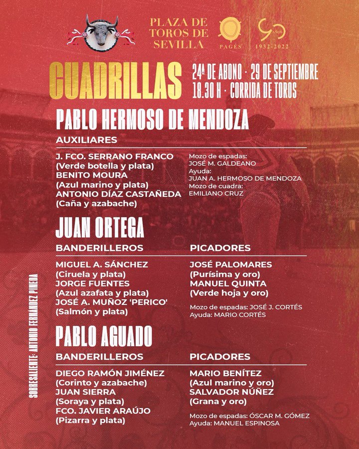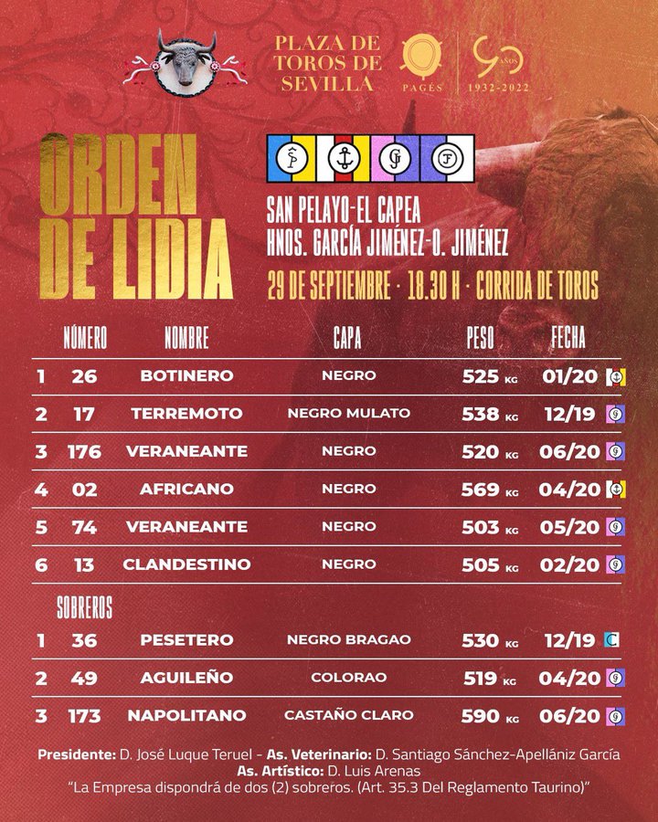 Orden de lidia de los toros de El Capea – San Pelayo, Hnos. García Jiménez – Olga Jiménez para la 24ª de abono sevillano