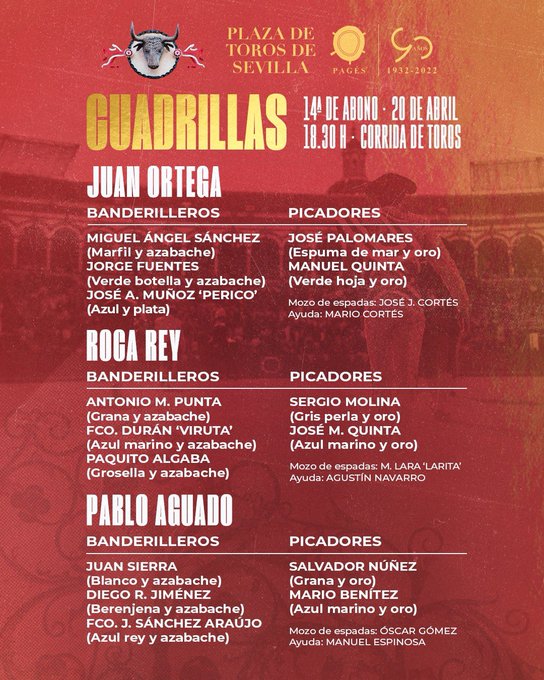 El orden de lidia y las cuadrillas son las siguientes: