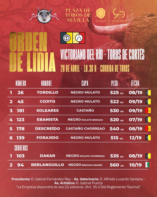 Orden de lidia de los toros de Victoriano del Río – Toros de Cortés para la 14ª de abono