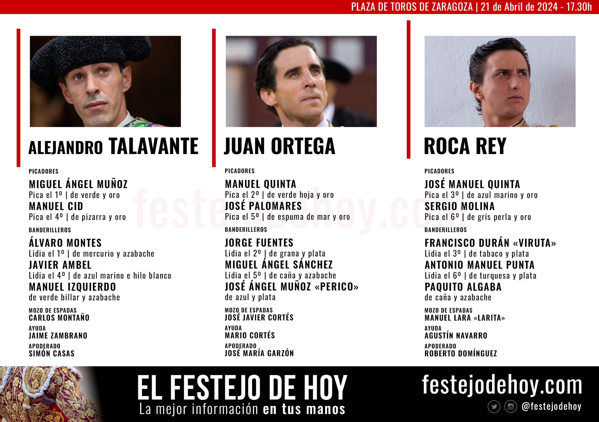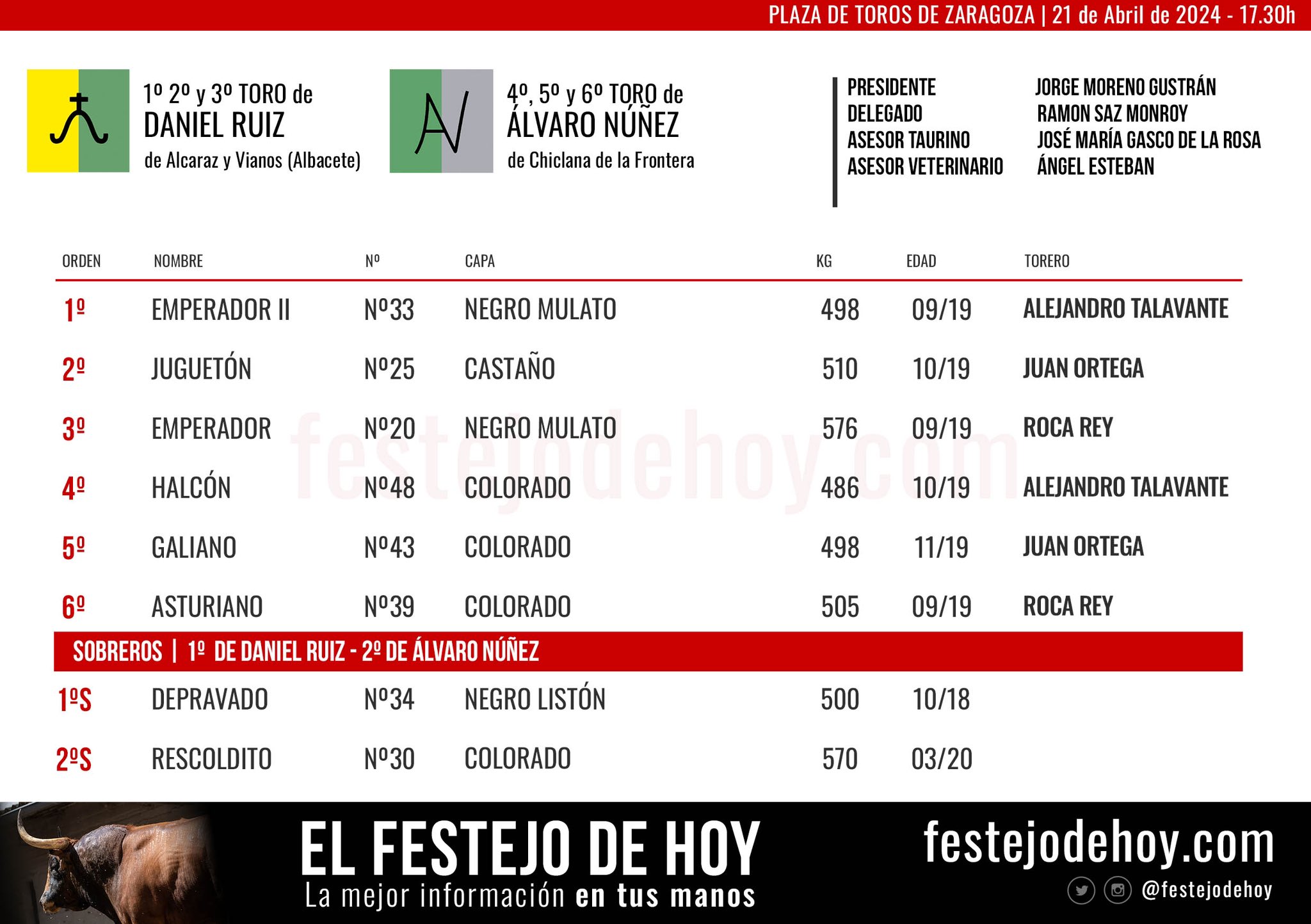Sorteados y enchiquerados los toros de Daniel Ruiz y Álvaro Núñez para esta tarde en Zaragoza y que serán lidiados por Alejandro Talavante, Juan Ortega y Roca Rey. El orden de lidia y las cuadrillas son las siguiente: Imagenes: @festejohoy Navegación de entradas Seis de Los Chospes para la última novillada del mes de abril en Las VentasEn vídeo el enchiqueramiento de novillos de Los Chospes en Las Ventas