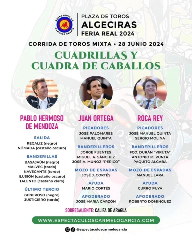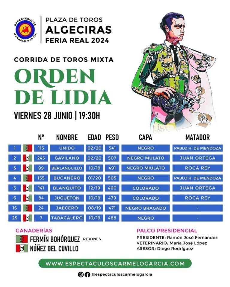 Sorteados y enchiquerados los toros de Núñez del Cuvillo y Fermín Bohórquez para la tercera de la Feria Real de Algeciras y que serán estoqueados por el rejoneador Pablo Hermoso de Mendoza y los diestros Juan Ortega y Andrés Roca Roca Rey.