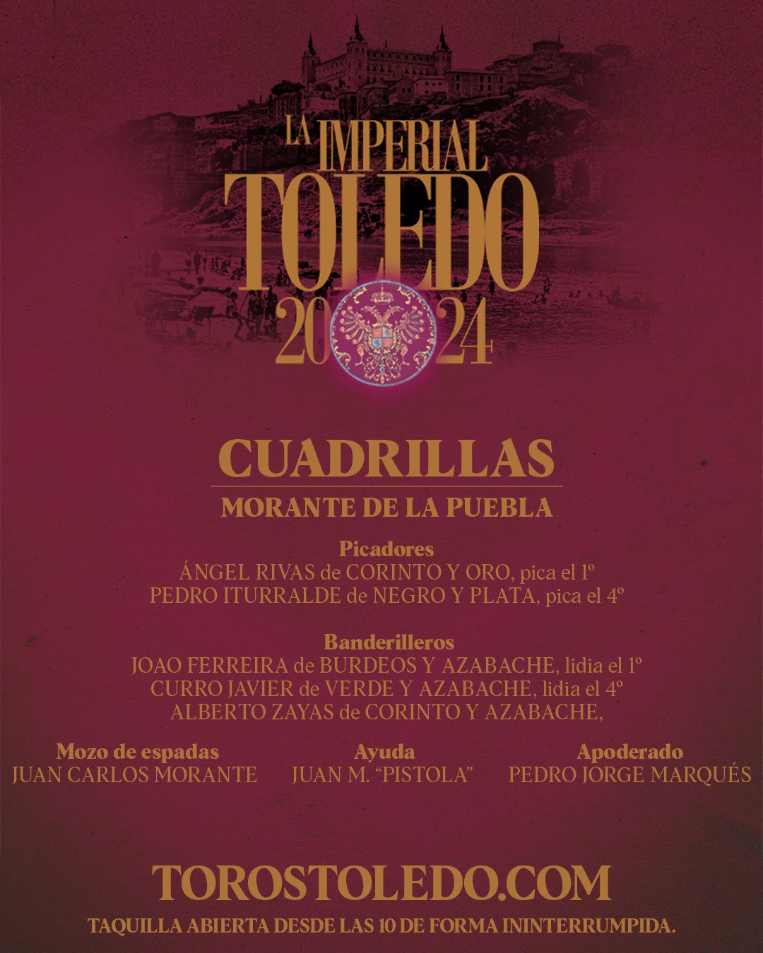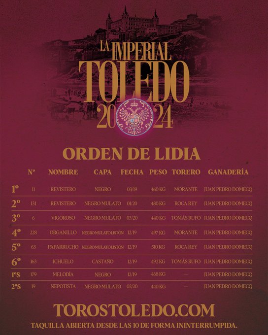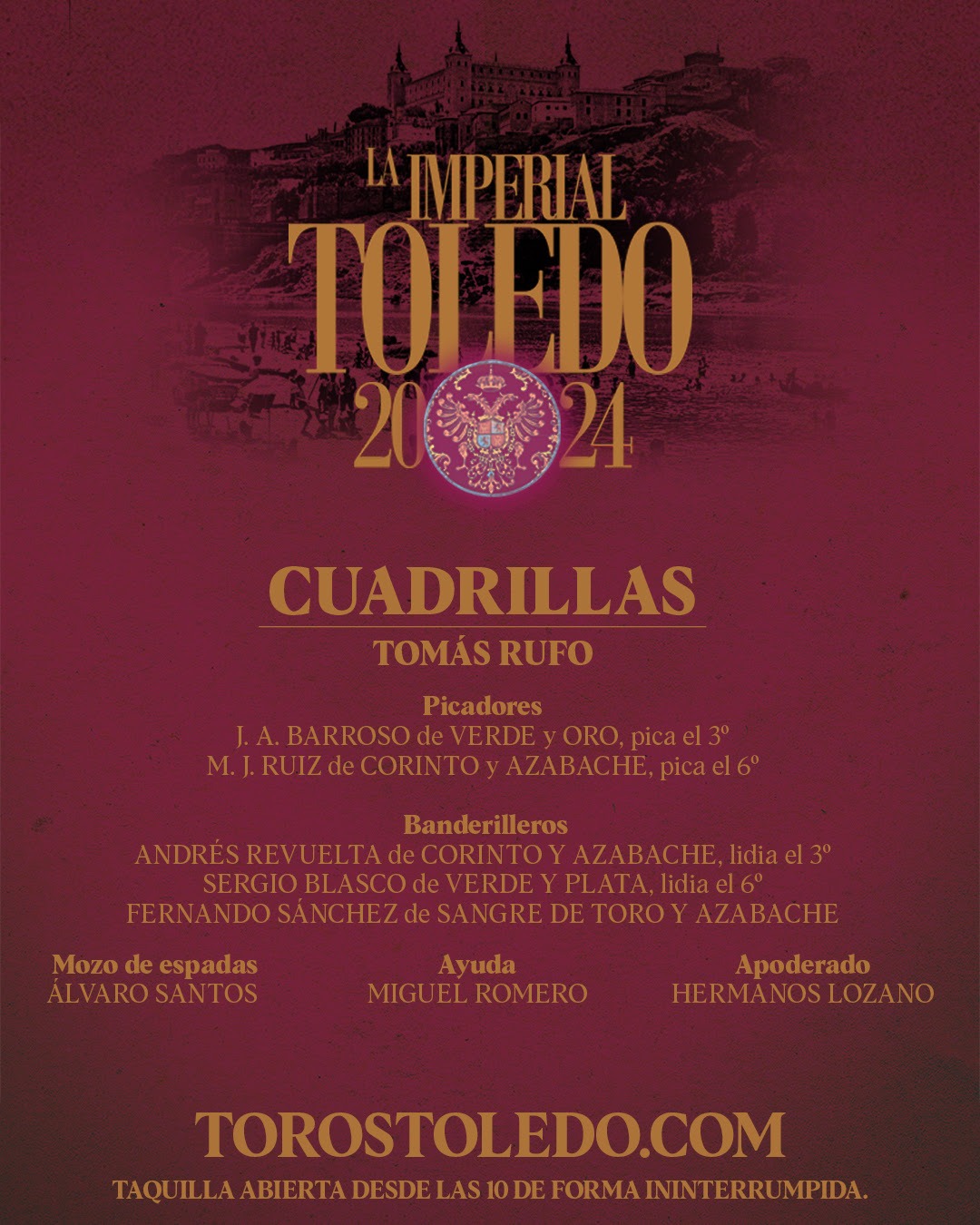 Para aquellos que aún no han adquirido sus entradas, todavía están disponibles en la taquilla de la plaza de toros de Toledo. La taquilla estará abierta hoy, 30 de mayo, desde las 10:00 de la mañana de forma ininterrumpida hasta el inicio del evento. Las entradas también se pueden adquirir en la página oficial www.torostoledo.com y a través del teléfono 695 201 966.