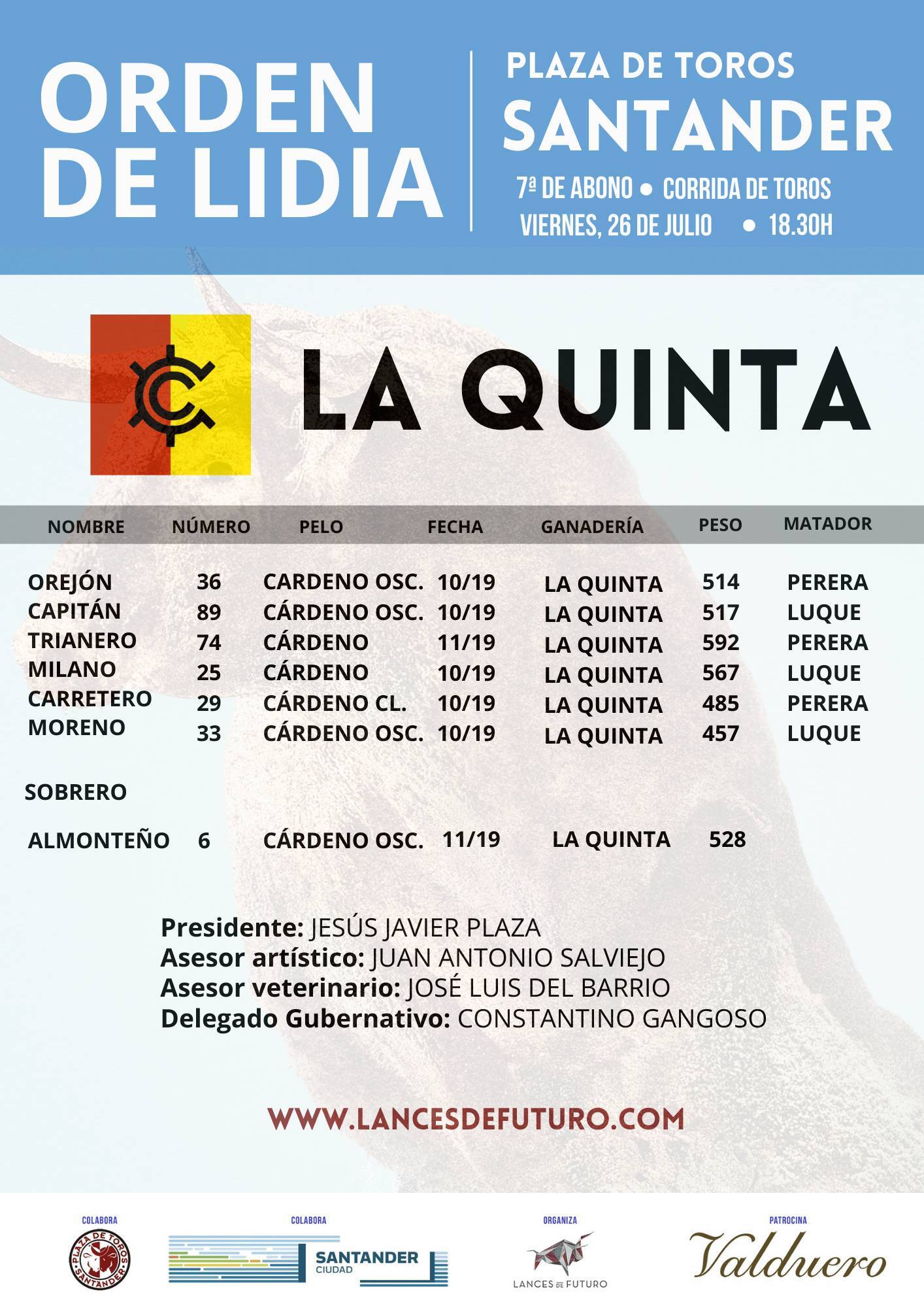 Sorteados y enchiquerados los toros de La Quinta para la última de la Feria de Santiago de Santander y que serán lidiados por Miguel Ángel Perera y Daniel Luque, en mano a mano, a partir de las 18:30 horas.