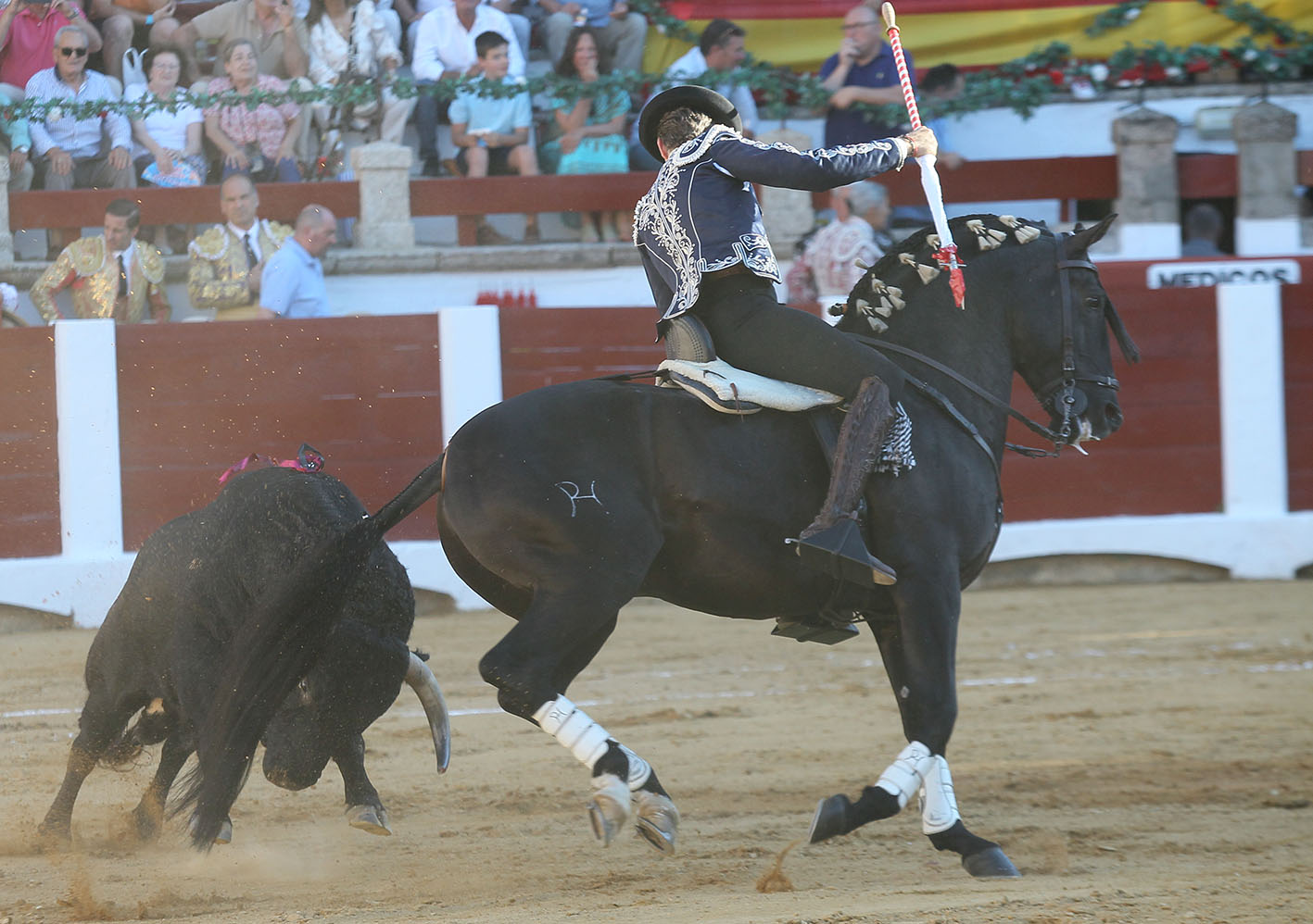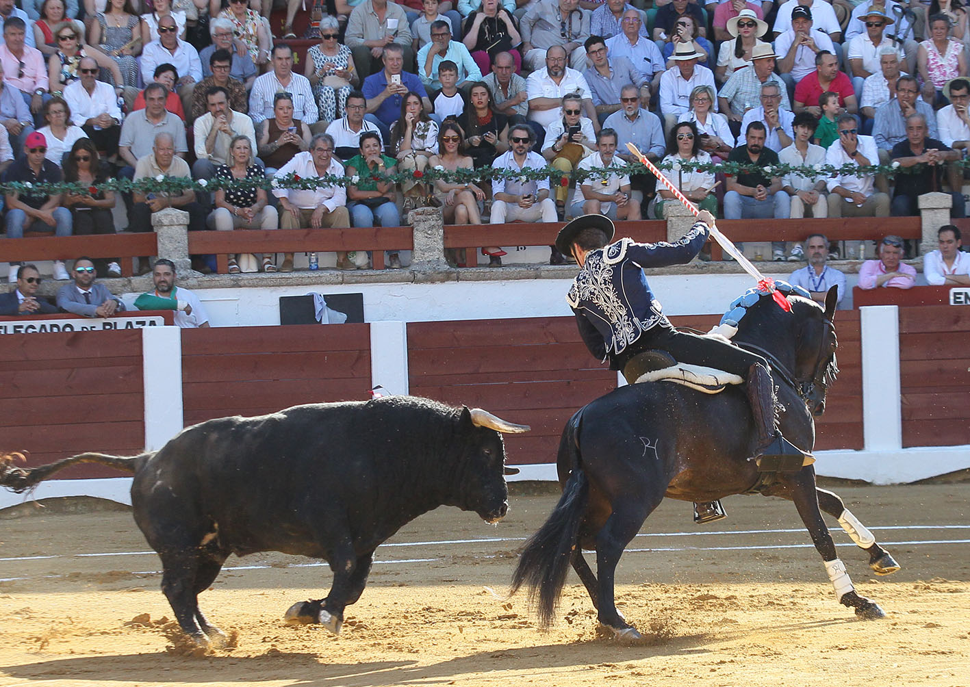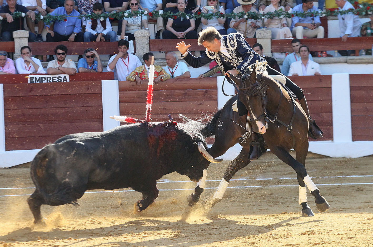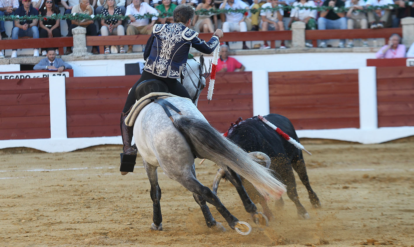 JIBARO que casi a cámara lenta le fue bajando la velocidad hasta dejarlo suave y templado. Un rejón de castigo de plaza a plaza y colocado en todo lo alto fue el relevo perfecto para que BERLIN comenzara lo que parecía iba a ser una nueva sinfonía luso-alemana. Y así comenzó, con unas hermosinas plenas de cadencia y suavidad y con una banderilla de poder que pusieron al tendido a levitar. La mala noticia vino en la segunda banderilla, cuando el toro golpeó a BERLIN en su posterior derecha y lo dejó muy dolorido. Fue una especie de “bocadillo” que acalambró la zona, pero que afortunadamente solo quedó en el golpe. No obstante, el susto fue gordo, porque BERLIN abandonó la plaza sin apoyar y fue sustituido por TALENTO. La lidia tenía que continuar y el castaño se puso el traje de BERLIN y comenzó a torear de costado, a medir al toro y a llevarlo junto a la tablas rematando con trincherazos ajustados. Cambió de registro con un MALBEC muy frontal, llegando a la cara del toro, al que ya le costaba más embestir, y dejando las banderillas en los alto. Remató con piruetas todas las suertes y continuó la fiesta en las cortas sobre GENEROSO, que fue dejando una tras otra, con el toro ya muy parado y llegándole mucho. Tras un desplante del teléfono, Pablo agarró el rejón de muerte y se fue con la fé que da la labor bien hecha para certificar el triunfo con un rejonazo perfecto y espectacular y hacer que el tendido se tiñera de ese blanco pañuelo para concederle la salida a hombros en esta reapertura del precioso y antiguo coso cacereño.