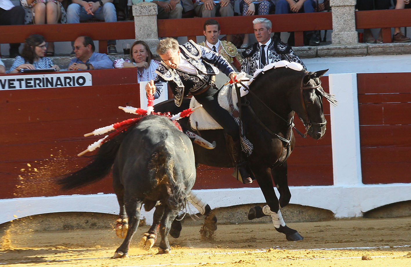 Sin ella, lidiar a un toro de estas características es muy difícil y sacar algo de lucimiento, imposible. Desde el tercio de salida, REGALIZ tenía que lidiar los redondos y el toreo con la cola o con la bandera con la salida de los rejones de castigo. Si clavabas y dejabas al toro salir suelto, tenían que volver a buscar al toro a tablas. Así de cada rejón o de cada banderilla, había que aguantar al caballo apenas pasado el pitón para enganchar al toro y que este continuara en la pelea. Así cuajó buenos momentos con REGALIZ, NAVEGANTE e ILUSIÓN porque a los palitroques, lo esperaban y lo llevaban bien en circulares, bien en galopes en galopes de costado o bien toreado con el pecho. Una faena que Pablo se inventó e incluso en los que consiguió breves momentos brillantes gracias a esa técnica amasada durante años. Cerró la labor con tres buenas cortas, la suerte del teléfono y un rejón de muerte al segundo intento. Hubo leve petición y Pablo fue sacado el tercio a saludar una unánime ovación del respetable.